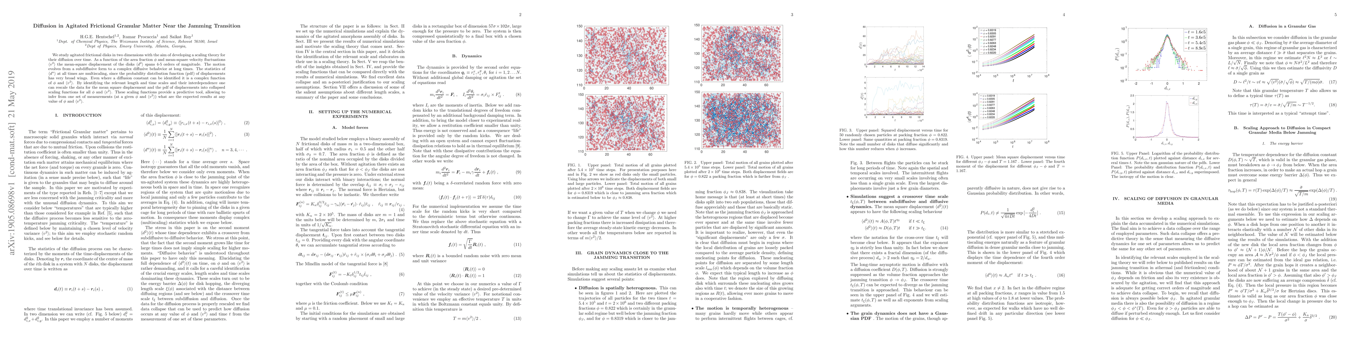 We study agitated frictional disks in two dimensions with the aim of developing a scaling theory for their diffusion over time. As a function of the area fraction $\phi$ and mean-square velocity fluctuations $\langle v^2\rangle$ the mean-square displacement of the disks $\langle d^2\rangle$ spans 4-5 orders of magnitude. The motion evolves from a subdiffusive form to a complex diffusive behabvior at long times. The statistics of $\langle d^n\rangle$ at all times are multiscaling, since the probability distribution function (pdf) of displacements has very broad wings. Even where a diffusion constant can be identified it is a complex function of $\phi$ and $\langle v^2\rangle$. By identifying the relevant length and time scales and their interdependence one can rescale the data for the mean square displacement and the pdf of displacements into collapsed scaling functions for all $\phi$ and $\langle v^2\rangle$. These scaling functions provide a predictive tool, allowing to infer from one set of measurements (at a given $\phi$ and $\langle v^2\rangle$) what are the expected results at any value of $\phi$ and $\langle v^2\rangle$.