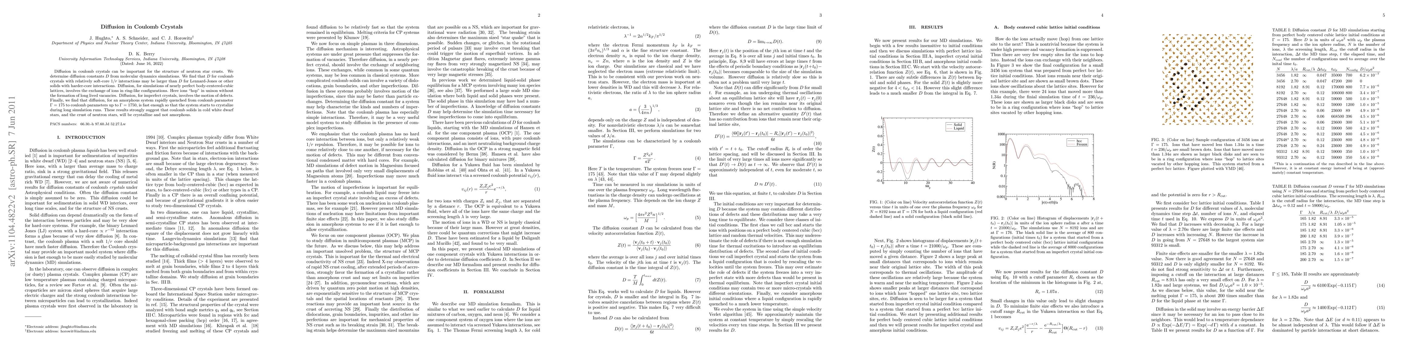 The study developed a methodology for calculating diffusion constants in Coulomb crystals using molecular dynamics simulations, providing insights into ion movement and structural stability in extreme astrophysical conditions.
