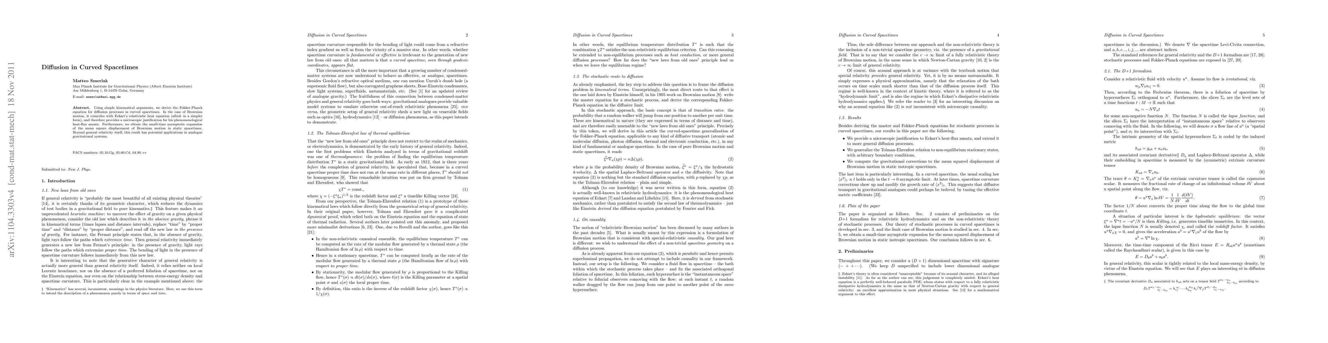 This paper derives the Fokker-Planck equation for diffusion in curved spacetimes, showing it aligns with Eckart's relativistic heat equation, providing microscopic support for his heat-flux assumption. It also presents the small-time asymptotic expansion for Brownian motion's mean square displacement in static curved spacetimes, with implications for analogue gravitational systems.