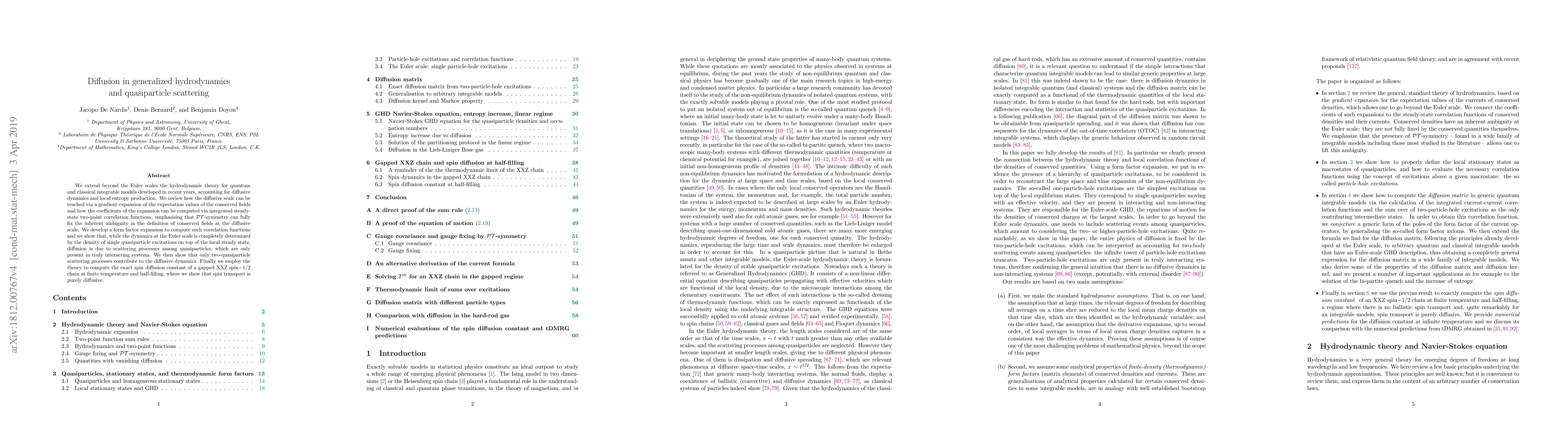 This paper extends hydrodynamic theory for integrable models to include diffusive dynamics and quasiparticle scattering. It emphasizes that PT-symmetry resolves ambiguities in conserved fields and identifies two-quasiparticle scattering as the primary contributor to diffusion, applying the theory to compute the exact spin diffusion constant in a XXZ spin-1/2 chain.