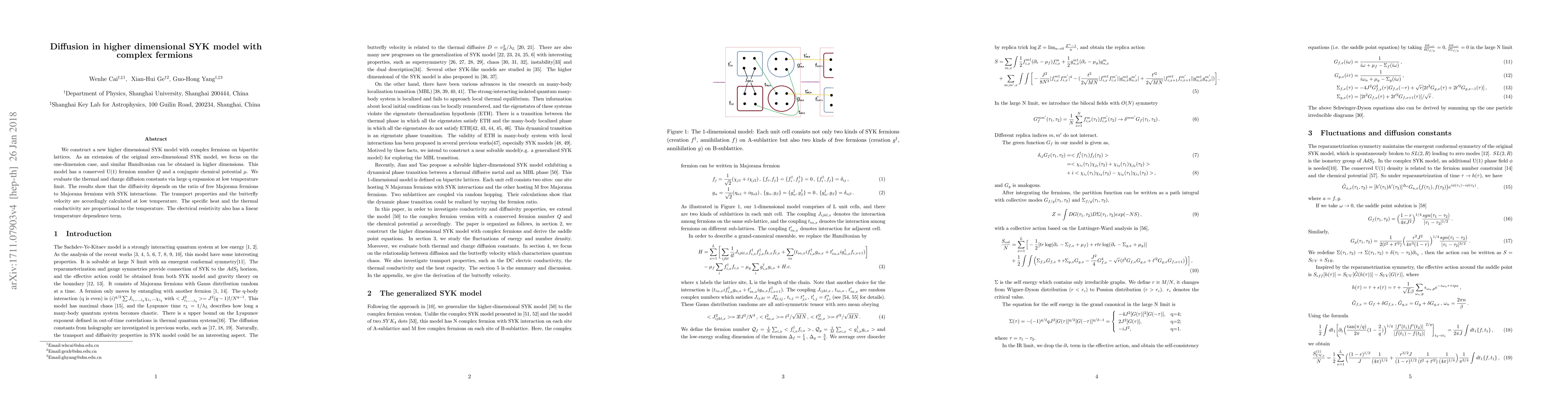 We construct a new higher dimensional SYK model with complex fermions on bipartite lattices. As an extension of the original zero-dimensional SYK model, we focus on the one-dimension case, and similar Hamiltonian can be obtained in higher dimensions. This model has a conserved U(1) fermion number Q and a conjugate chemical potential \mu. We evaluate the thermal and charge diffusion constants via large q expansion at low temperature limit. The results show that the diffusivity depends on the ratio of free Majorana fermions to Majorana fermions with SYK interactions. The transport properties and the butterfly velocity are accordingly calculated at low temperature. The specific heat and the thermal conductivity are proportional to the temperature. The electrical resistivity also has a linear temperature dependence term.
