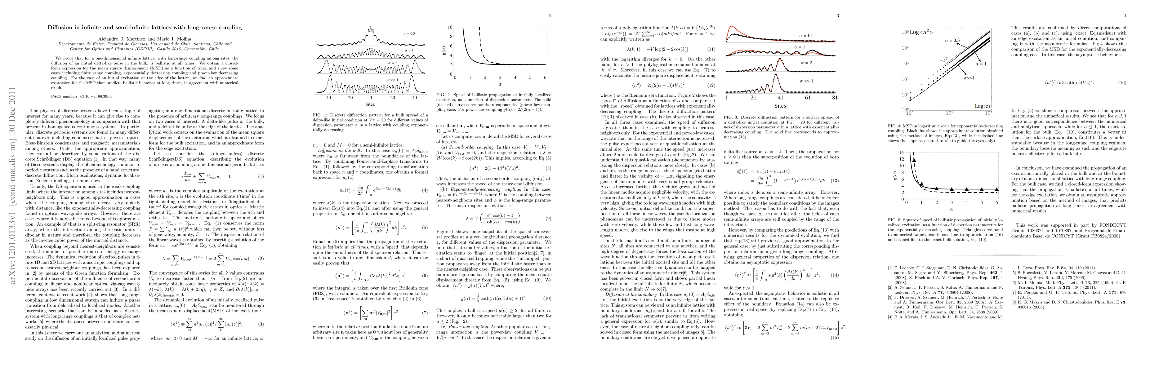 We prove that for a one-dimensional infinite lattice, with long-range coupling among sites, the diffusion of an initial delta-like pulse in the bulk, is ballistic at all times. We obtain a closed-form expression for the mean square displacement (MSD) as a function of time, and show some cases including finite range coupling, exponentially decreasing coupling and power-law decreasing coupling. For the case of an initial excitation at the edge of the lattice, we find an approximate expression for the MSD that predicts ballistic behavior at long times, in agreement with numerical results.