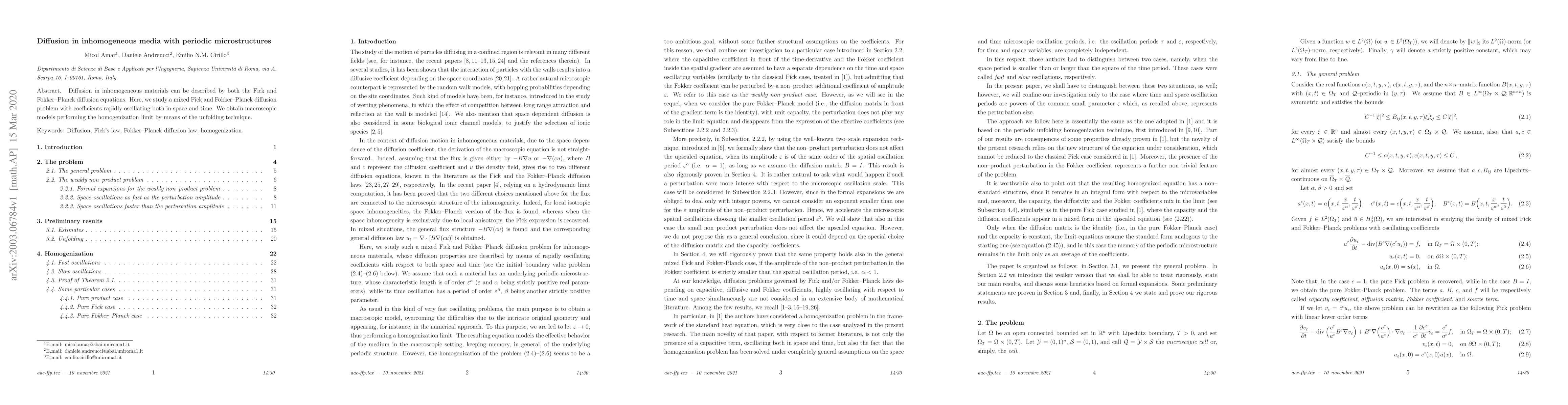 This paper investigates the diffusion process in inhomogeneous materials with periodic microstructures, employing both Fick and Fokker-Planck equations. The authors derive macroscopic models through homogenization using the unfolding technique for rapidly oscillating coefficients in space and time.