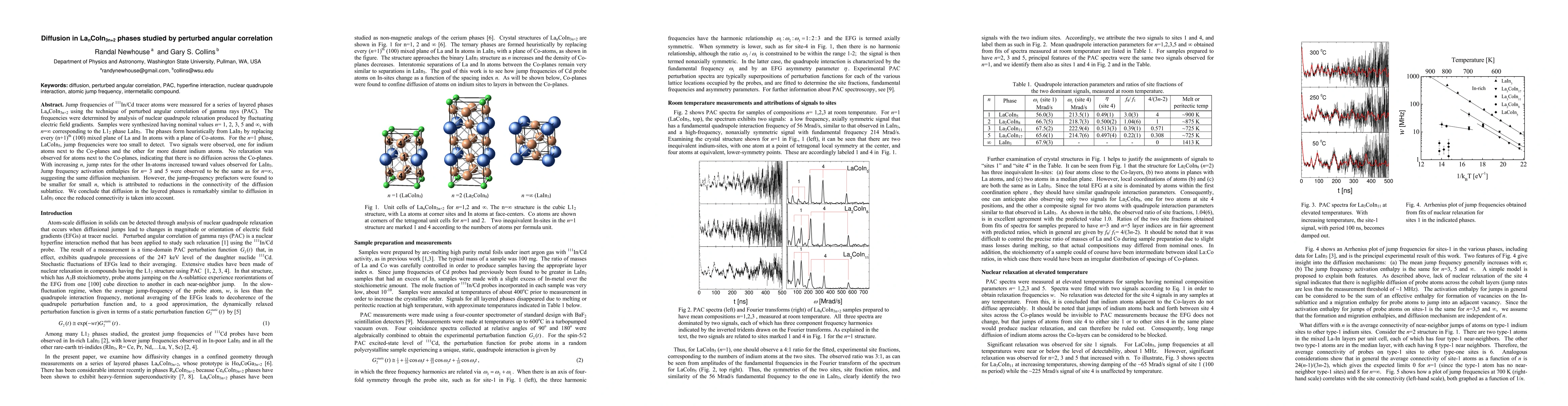 Jump frequencies of 111In/Cd tracer atoms were measured for a series of layered phases LanCoIn3n+2 using the technique of perturbed angular correlation of gamma rays (PAC). The frequencies were determined by analysis of nuclear quadrupole relaxation produced by fluctuating electric field gradients. Samples were synthesized having nominal values n= 1, 2, 3, 5 and \infty, with n=\infty corresponding to the L12 phase LaIn3. The phases form heuristically from LaIn3 by replacing every (n+1)th (100) mixed plane of La and In atoms with a plane of Co-atoms. For the n=1 phase, LaCoIn5, jump frequencies were too small to detect. Two signals were observed, one for indium atoms next to the Co-planes and the other for more distant indium atoms. No relaxation was observed for atoms next to the Co-planes, indicating that there is no diffusion across the Co-planes. With increasing n, jump rates for the other In-atoms increased toward values observed for LaIn3. Jump frequency activation enthalpies for n= 3 and 5 were observed to be the same as for n=\infty, suggesting the same diffusion mechanism. However, the jump-frequency prefactors were found to be smaller for small n, which is attributed to reductions in the connectivity of the diffusion sublattice. We conclude that diffusion in the layered phases is remarkably similar to diffusion in LaIn3 once the reduced connectivity is taken into account.