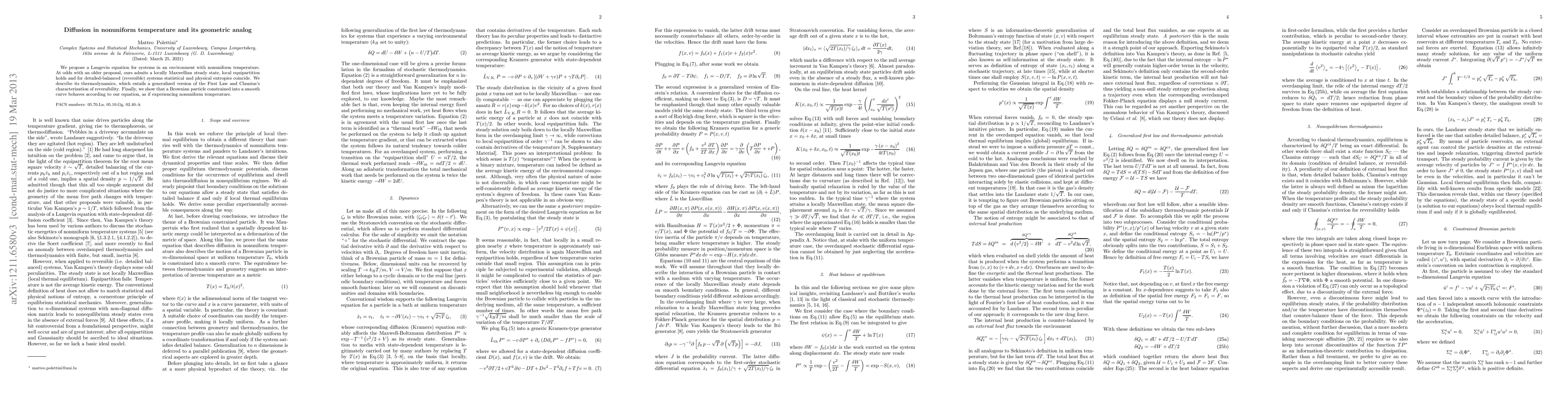 We propose a Langevin equation for systems in an environment with nonuniform temperature. At odds with an older proposal, ours admits a locally Maxwellian steady state, local equipartition holds and for detailed-balanced (reversible) systems statistical and physical entropies coincide. We describe its thermodynamics, which entails a generalized version of the First Law and Clausius's characterization of reversibility. Finally, we show that a Brownian particle constrained into a smooth curve behaves according to our equation, as if experiencing nonuniform temperature.