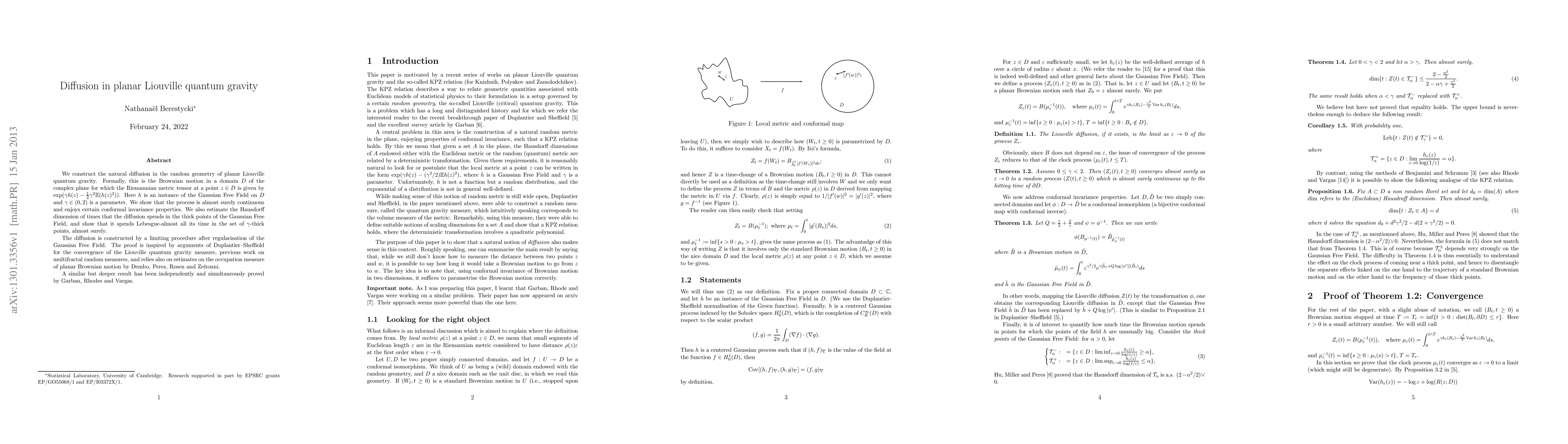 This paper constructs the natural diffusion in planar Liouville quantum gravity, showing it is almost surely continuous and spends most of its time in thick points of the Gaussian Free Field.