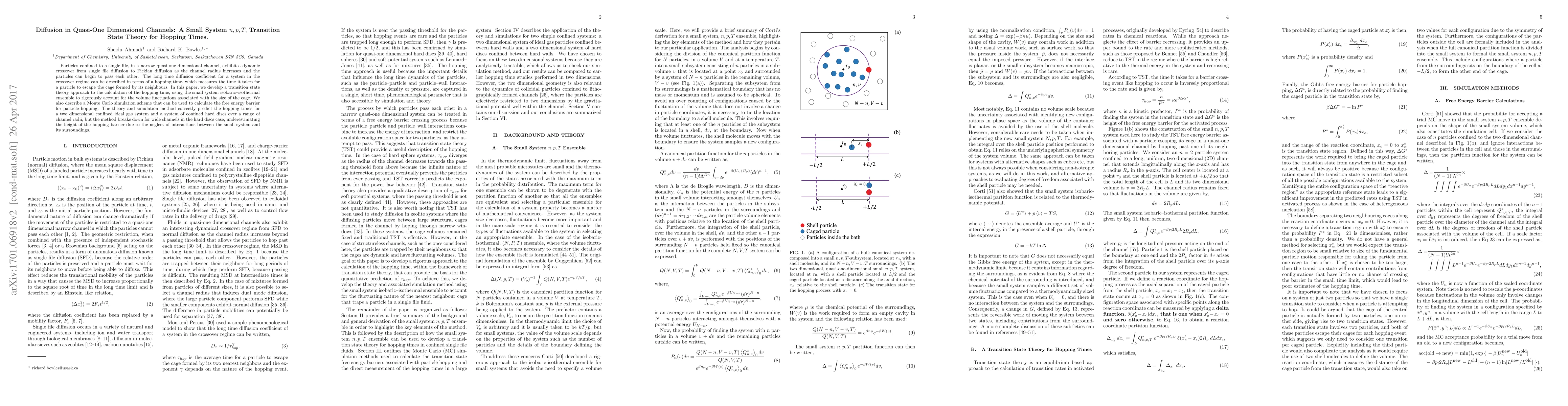 Particles confined to a single file, in a narrow quasi-one dimensional channel, exhibit a dynamic crossover from single file diffusion to Fickian diffusion as the channel radius increases and the particles can begin to pass each other. The long time diffusion coefficient for a system in the crossover regime can be described in terms of a hopping time, which measures the time it takes for a particle to escape the cage formed by its neighbours. In this paper, we develop a transition state theory approach to the calculation of the hopping time, using the small system isobaric--isothermal ensemble to rigorously account for the volume fluctuations associated with the size of the cage. We also describe a Monte Carlo simulation scheme that can be used to calculate the free energy barrier for particle hopping. The theory and simulation method correctly predict the hopping times for a two dimensional confined ideal gas system and a system of confined hard discs over a range of channel radii, but the method breaks down for wide channels in the hard discs case, underestimating the height of the hopping barrier due to the neglect of interactions between the small system and its surroundings.