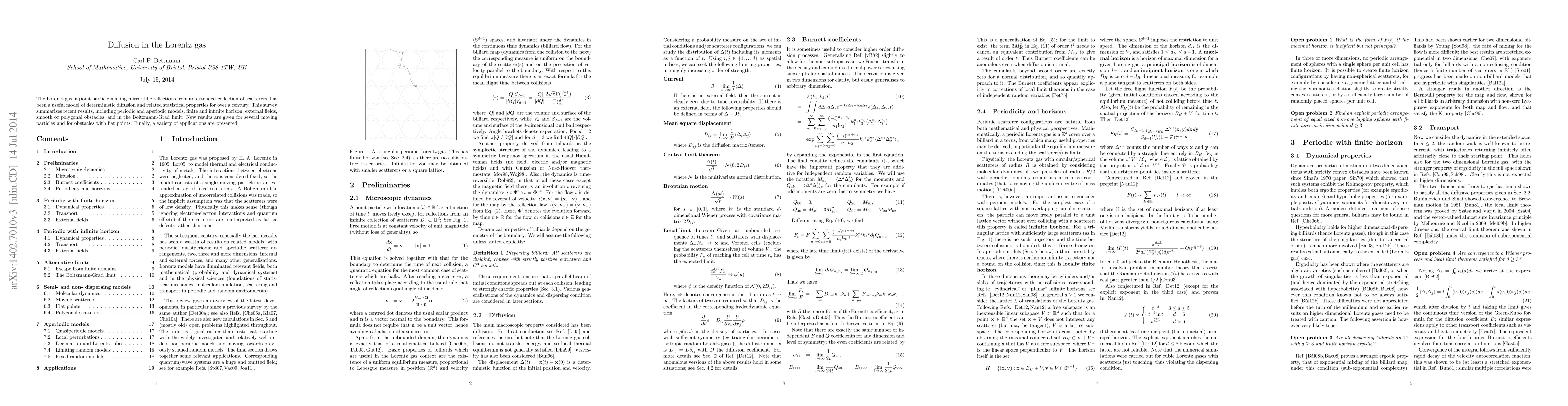The Lorentz gas, a point particle making mirror-like reflections from an extended collection of scatterers, has been a useful model of deterministic diffusion and related statistical properties for over a century. This survey summarises recent results, including periodic and aperiodic models, finite and infinite horizon, external fields, smooth or polygonal obstacles, and in the Boltzmann-Grad limit. New results are given for several moving particles and for obstacles with flat points. Finally, a variety of applications are presented.