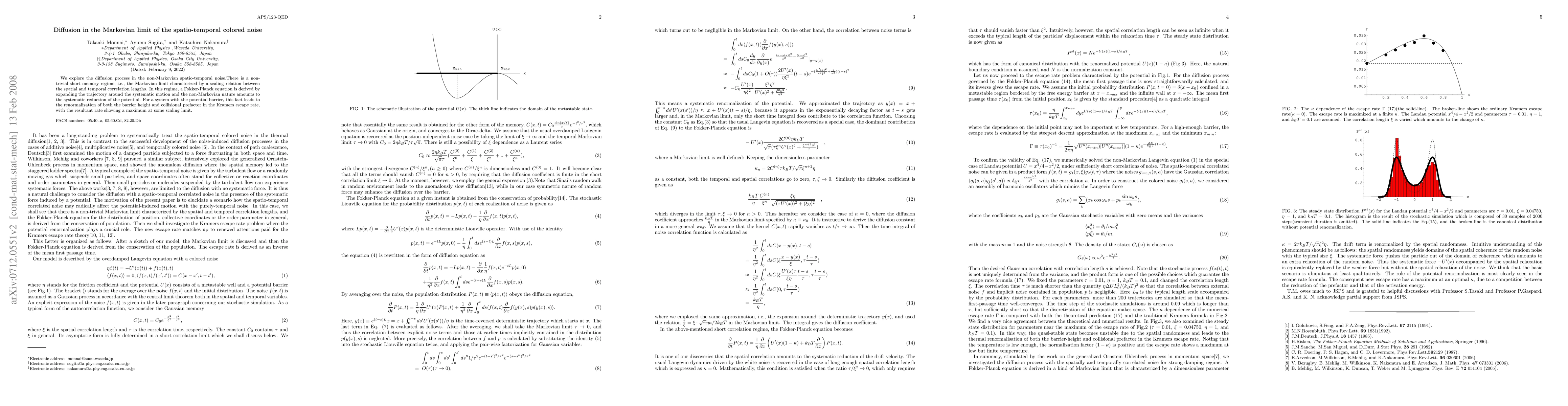 We explore the diffusion process in the non-Markovian spatio-temporal noise.%the escape rate problem in the non-Markovian spatio-temporal random noise. There is a non-trivial short memory regime, i.e., the Markovian limit characterized by a scaling relation between the spatial and temporal correlation lengths. In this regime, a Fokker-Planck equation is derived by expanding the trajectory around the systematic motion and the non-Markovian nature amounts to the systematic reduction of the potential. For a system with the potential barrier, this fact leads to the renormalization of both the barrier height and collisional prefactor in the Kramers escape rate, with the resultant rate showing a maximum at some scaling limit.