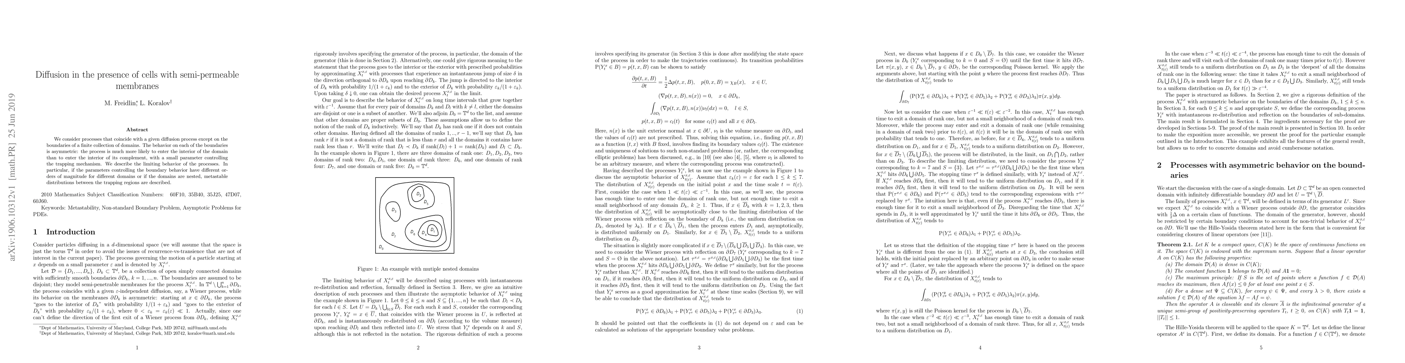 Researchers studied how a diffusion process behaves near cells with semi-permeable membranes, finding that it tends to enter the interior of one domain over others, leading to metastable distributions under certain conditions.