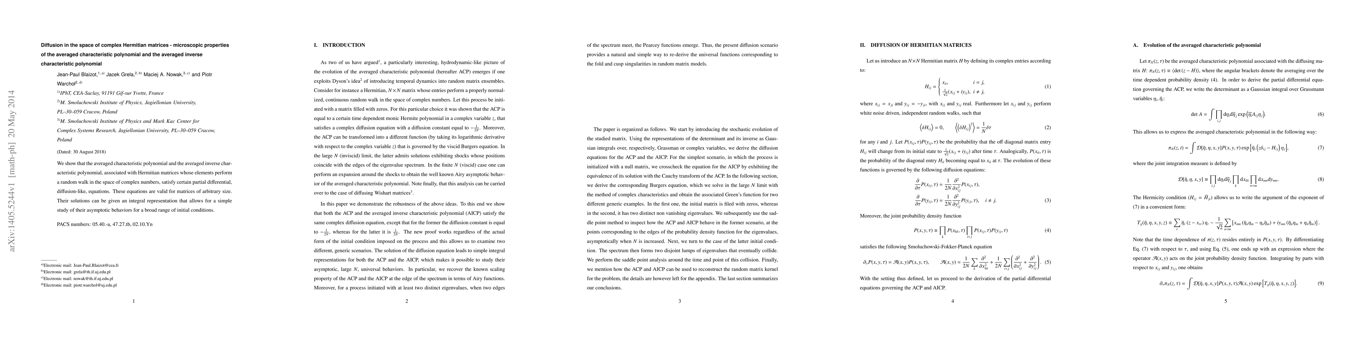 We show that the averaged characteristic polynomial and the averaged inverse characteristic polynomial, associated with Hermitian matrices whose elements perform a random walk in the space of complex numbers, satisfy certain partial differential, diffusion-like, equations. These equations are valid for matrices of arbitrary size. Their solutions can be given an integral representation that allows for a simple study of their asymptotic behaviors for a broad range of initial conditions.