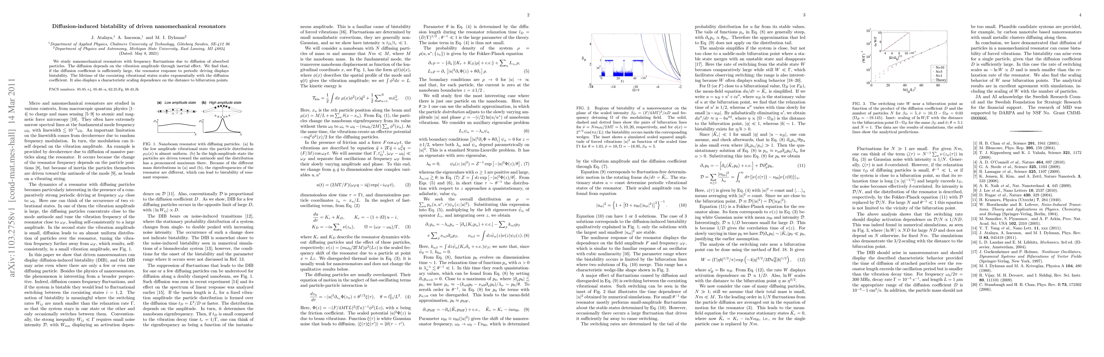 We study nanomechanical resonators with frequency fluctuations due to diffusion of absorbed particles. The diffusion depends on the vibration amplitude through inertial effect. We find that, if the diffusion coefficient is sufficiently large, the resonator response to periodic driving displays bistability. The lifetime of the coexisting vibrational states scales exponentially with the diffusion coefficient. It also displays a characteristic scaling dependence on the distance to bifurcation points.