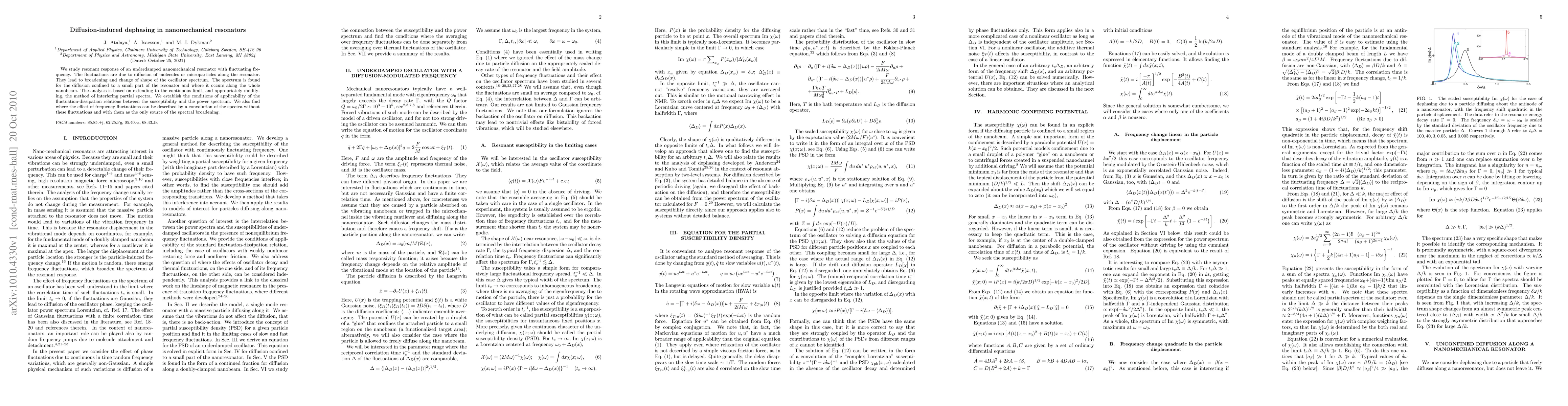 We study resonant response of an underdamped nanomechanical resonator with fluctuating frequency. The fluctuations are due to diffusion of molecules or microparticles along the resonator. They lead to broadening and change of shape of the oscillator spectrum. The spectrum is found for the diffusion confined to a small part of the resonator and where it occurs along the whole nanobeam. The analysis is based on extending to the continuous limit, and appropriately modifying, the method of interfering partial spectra. We establish the conditions of applicability of the fluctuation-dissipation relations between the susceptibility and the power spectrum. We also find where the effect of frequency fluctuations can be described by a convolution of the spectra without these fluctuations and with them as the only source of the spectral broadening.