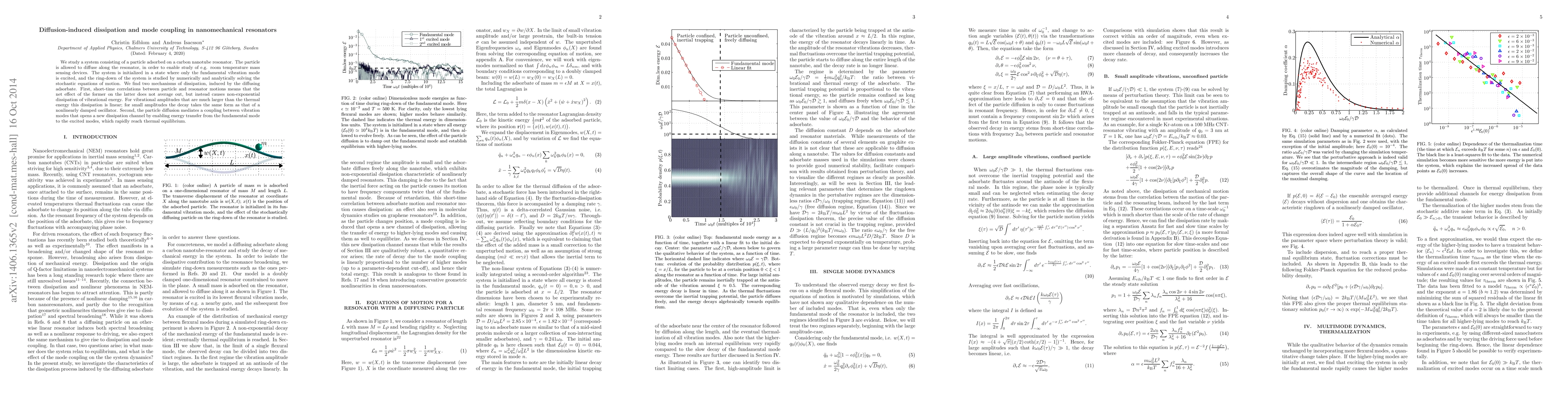 We study a system consisting of a particle adsorbed on a carbon nanotube resonator. The particle is allowed to diffuse along the resonator, in order to enable study of e.g. room temperature mass sensing devices. The system is initialized in a state where only the fundamental vibration mode is excited, and the ring-down of the system is studied by numerically and analytically solving the stochastic equations of motion. We find two mechanisms of dissipation, induced by the diffusing adsorbate. First, short-time correlations between particle and resonator motions means that the net effect of the former on the latter does not average out, but instead causes dissipation of vibrational energy. For vibrational amplitudes that are much larger than the thermal energy this dissipation is linear; for small amplitudes the decay takes the same form as that of a nonlinearly damped oscillator. Second, the particle diffusion mediates a coupling between vibration modes, enabling energy transfer from the fundamental mode to excited modes, which rapidly reach thermal equilibrium.