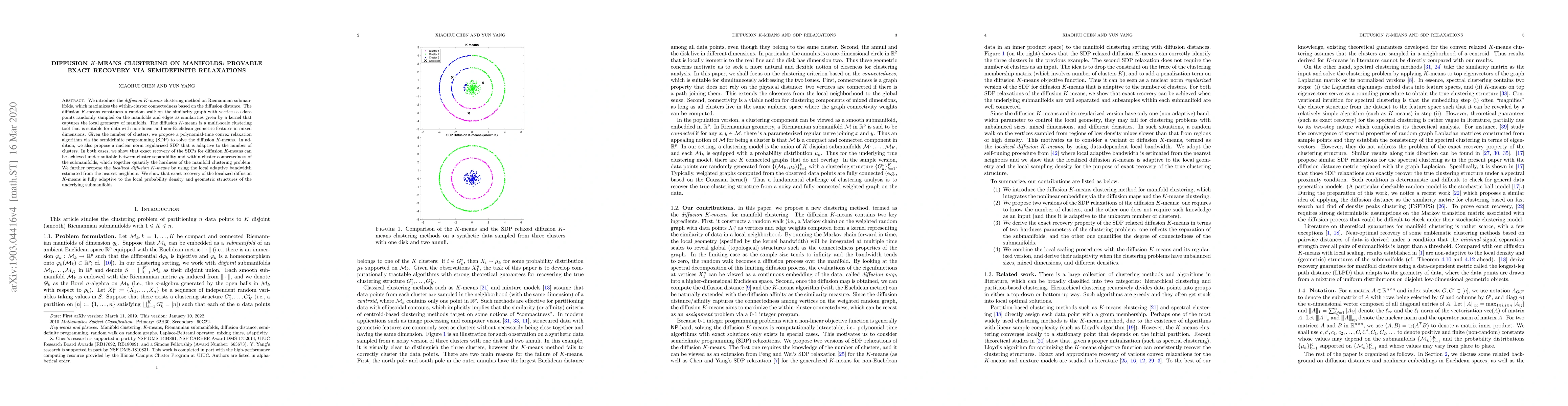 This paper introduces diffusion $K$-means clustering on Riemannian submanifolds, optimizing within-cluster connectedness via diffusion distance. It proposes a polynomial-time convex relaxation method using semidefinite programming for exact recovery, showing adaptability to non-linear data and local geometric structures.