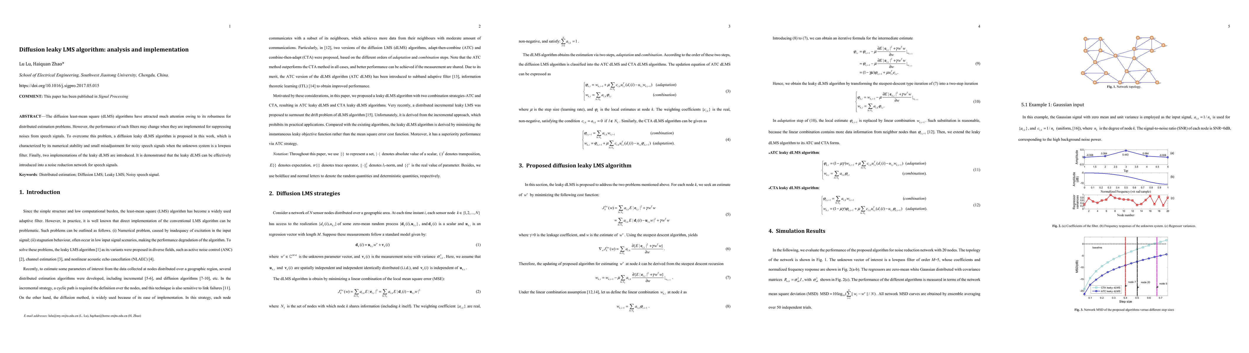 The diffusion least-mean square (dLMS) algorithms have attracted much attention owing to its robustness for distributed estimation problems. However, the performance of such filters may change when they are implemented for suppressing noises from speech signals. To overcome this problem, a diffusion leaky dLMS algorithm is proposed in this work, which is characterized by its numerical stability and small misadjustment for noisy speech signals when the unknown system is a lowpass filter. Finally, two implementations of the leaky dLMS are introduced. It is demonstrated that the leaky dLMS can be effectively introduced into a noise reduction network for speech signals.