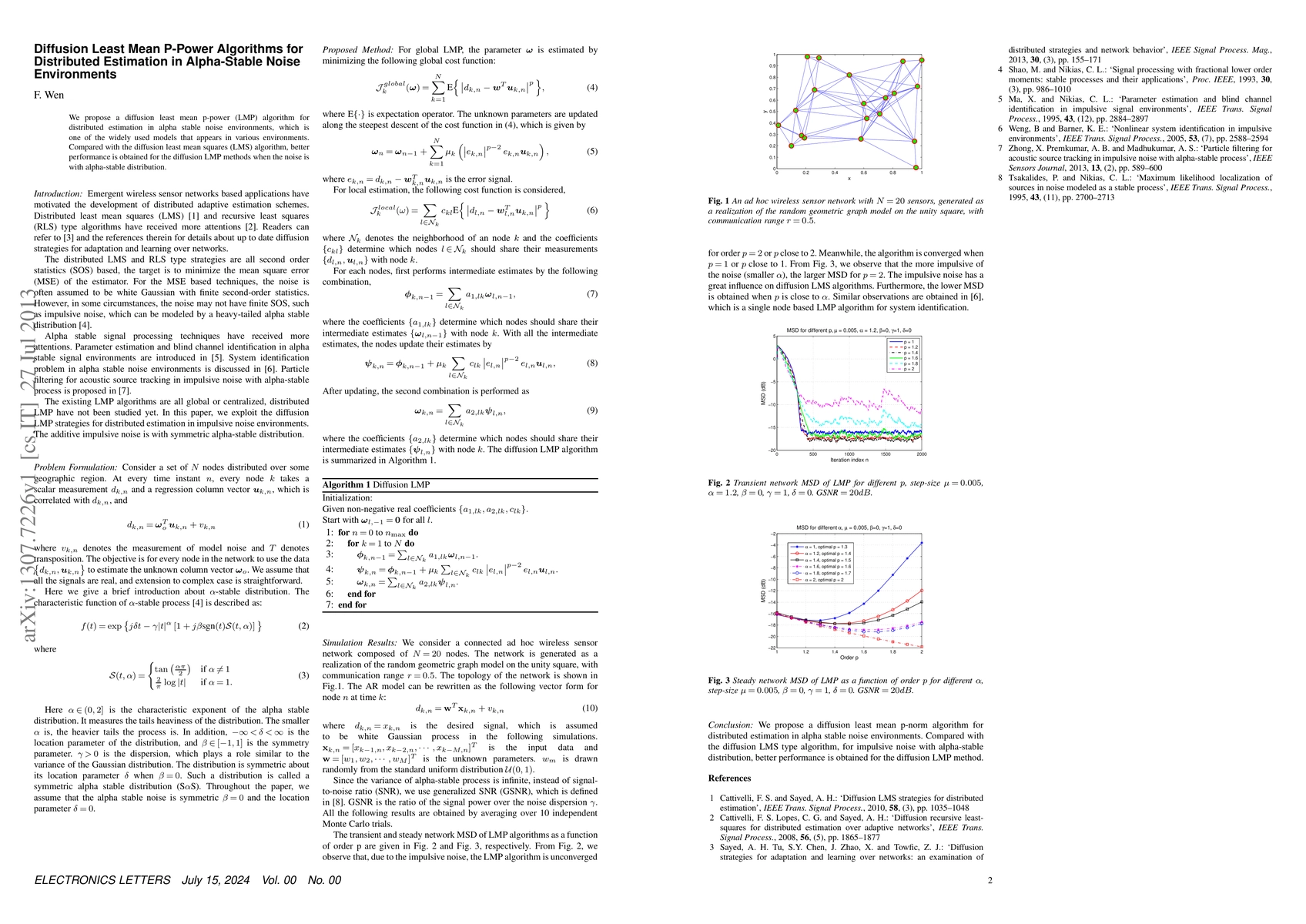 Summary: This paper introduces a diffusion least mean p-power (LMP) algorithm for distributed estimation in alpha-stable noise environments, demonstrating superior performance compared to the diffusion least mean squares (LMS) algorithm, especially under alpha-stable noise conditions.