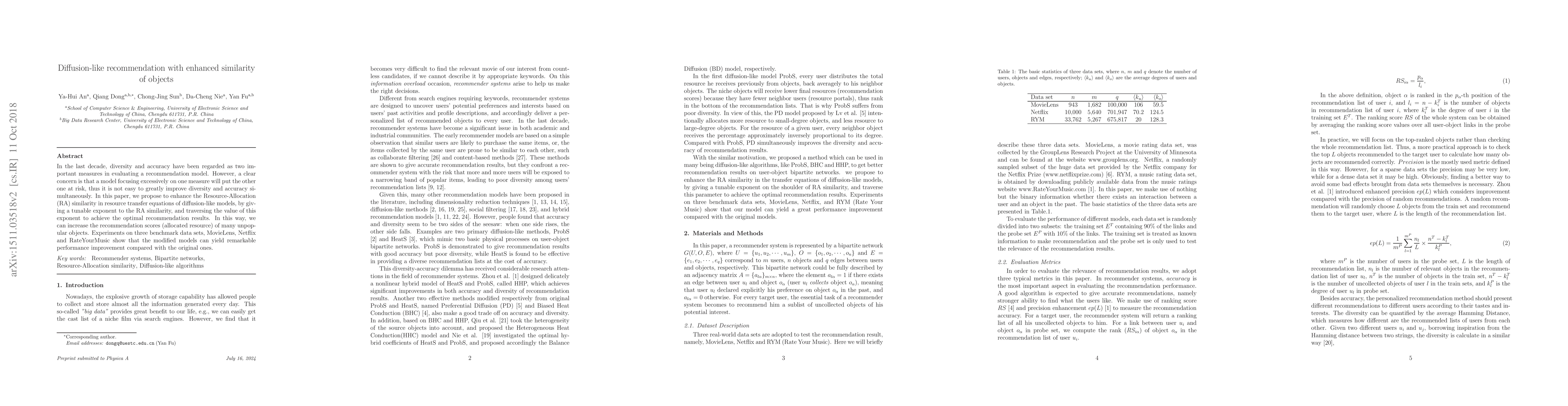 In last decades, diversity and accuracy have been regarded as two important measures in evaluating a recommendation model. However, a clear concern is that a model focusing excessively on one measure will put the other one at risk, thus it is not easy to greatly improve diversity and accuracy simultaneously. In this paper, we propose to enhance the Resource-Allocation (RA) similarity in resource transfer equations of diffusion-like models, by giving a tunable exponent to the RA similarity, and traversing the value of the exponent to achieve the optimal recommendation results. In this way, we can increase the recommendation scores (allocated resource) of many unpopular objects. Experiments on three benchmark data sets, MovieLens, Netflix, and RateYourMusic show that the modified models can yield remarkable performance improvement compared with the original ones.