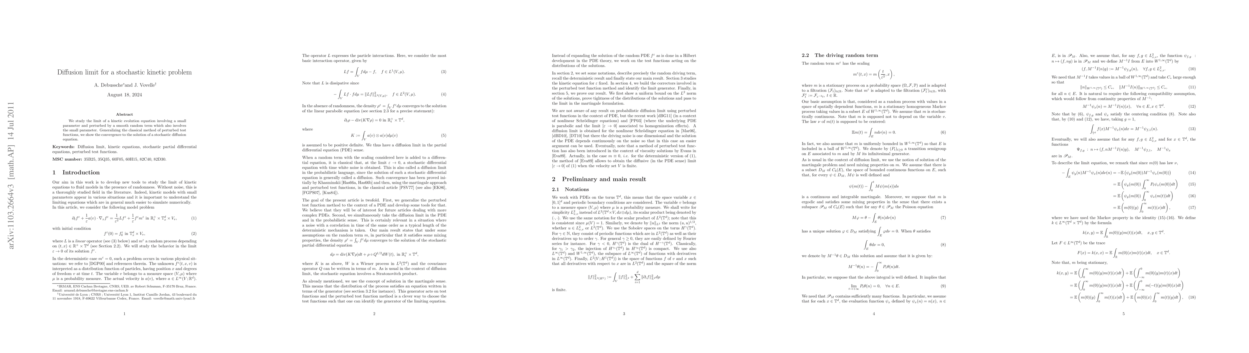 Summary: This paper investigates the limit behavior of a kinetic evolution equation with a small parameter and a stochastic perturbation. It generalizes the method of perturbed test functions to demonstrate convergence to a stochastic diffusion equation.