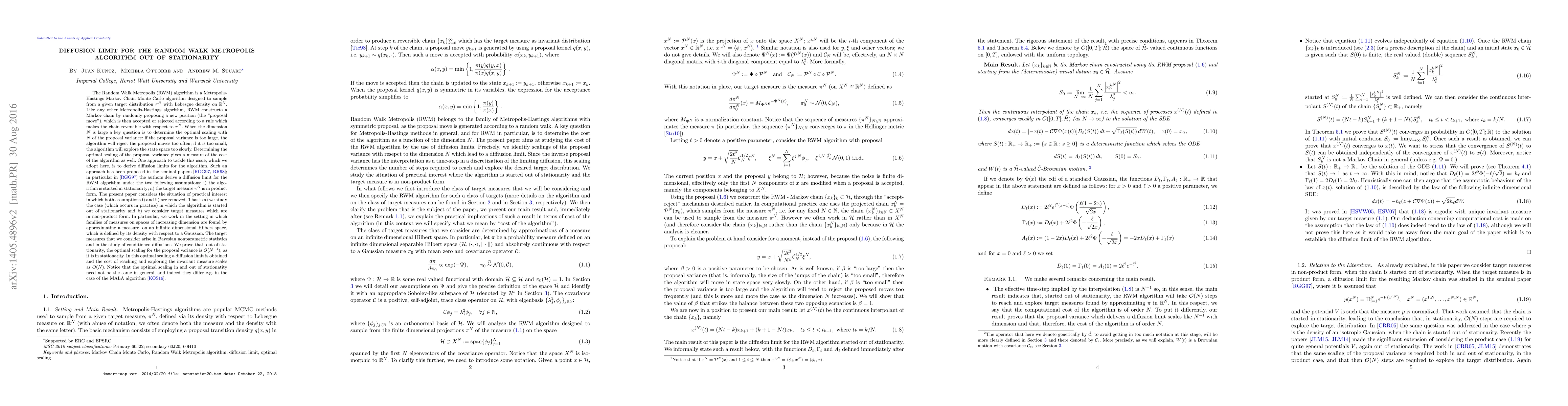 The Random Walk Metropolis (RWM) algorithm is a Metropolis- Hastings MCMC algorithm designed to sample from a given target distribution \pi with Lebesgue density on R^N. RWM constructs a Markov chain by randomly proposing a new position (the "proposal move"), which is then accepted or rejected according to a rule which makes the chain reversible with respect to \pi. When the dimension N is large a key question is to determine the optimal scaling with N of the proposal variance: if the proposal variance is too large, the algorithm will reject the proposed moves too often; if it is too small, the algorithm will explore the state space too slowly. Determining the optimal scaling of the proposal variance gives a measure of the cost of the algorithm as well. One approach to tackle this issue, which we adopt here, is to derive diffusion limits for the algorithm. Such an approach has been proposed in the seminal papers [RGG97, RR98]; in particular in [RGG97] the authors derive a diffusion limit for the RWM algorithm under the two following assumptions: i) the algorithm is started in stationarity; ii) the target measure $\pi$ is in product form. The present paper considers the situation of practical interest in which both assumptions i) and ii) are removed. That is a) we study the case (which occurs in practice) in which the algorithm is started out of stationarity and b) we consider target measures which are in non-product form. The target measures that we consider arise in Bayesian nonparametric statistics and in the study of conditioned diffusions. We prove that, out of stationarity, the optimal scaling for the proposal variance is O(N), as it is in stationarity. Notice that the optimal scaling in and out of stationatity need not be the same in general, and indeed they differ e.g. in the case of the MALA algorithm [KOS16].