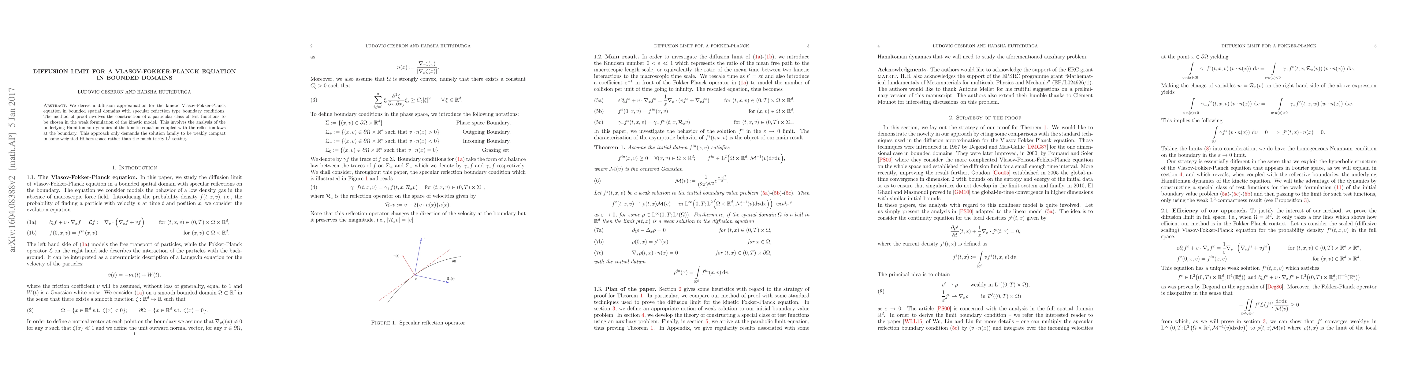 This paper derives a diffusion approximation for the Vlasov-Fokker-Planck equation in bounded domains with specular reflection boundary conditions, using a method that constructs specific test functions in the weak formulation and analyzes the Hamiltonian dynamics and reflection laws. The approach requires weak compactness in a weighted Hilbert space instead of the more complex $L^1$ setting.