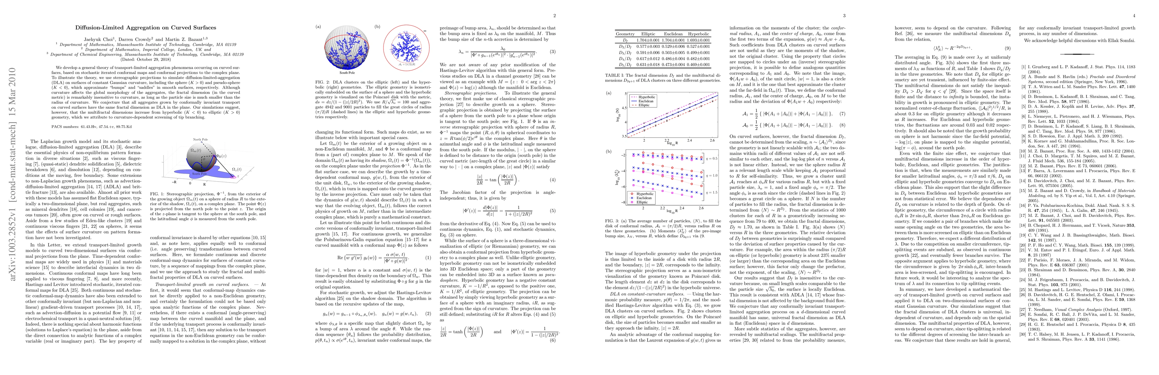 The research develops a general theory of transport-limited aggregation on curved surfaces using stochastic iterated conformal maps and conformal projections to the complex plane. Stereographic projections are used to simulate diffusion-limited aggregation (DLA) on surfaces of constant Gaussian curvature, including spheres and pseudo-spheres.