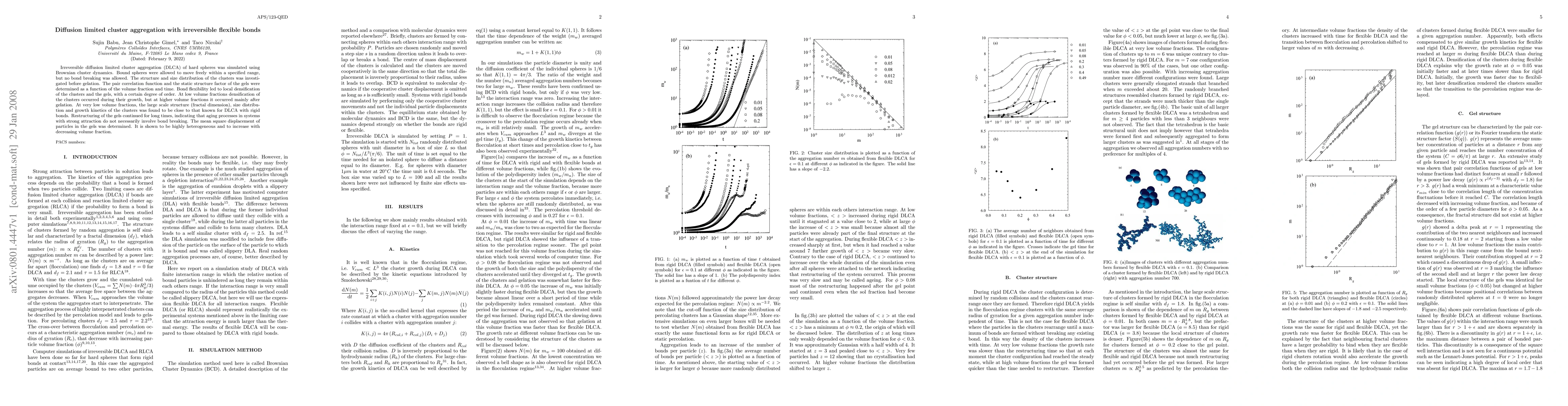 Irreversible diffusion limited cluster aggregation (DLCA) of hard spheres was simulated using Brownian cluster dynamics. Bound spheres were allowed to move freely within a specified range, but no bond breaking was allowed. The structure and size distribution of the clusters was investigated before gelation. The pair correlation function and the static structure factor of the gels were determined as a function of the volume fraction and time. Bond flexibility led to local densification of the clusters and the gels, with a certain degree of order. At low volume fractions densification of the clusters occurred during their growth, but at higher volume fractions it occurred mainly after gelation. At very low volume fractions, the large scale structure (fractal dimension), size distribution and growth kinetics of the clusters was found to be close to that known for DLCA with rigid bonds. Restructuring of the gels continued for long times, indicating that aging processes in systems with strong attraction do not necessarily involve bond breaking. The mean square displacement of particles in the gels was determined. It is shown to be highly heterogeneous and to increase with decreasing volume fraction.