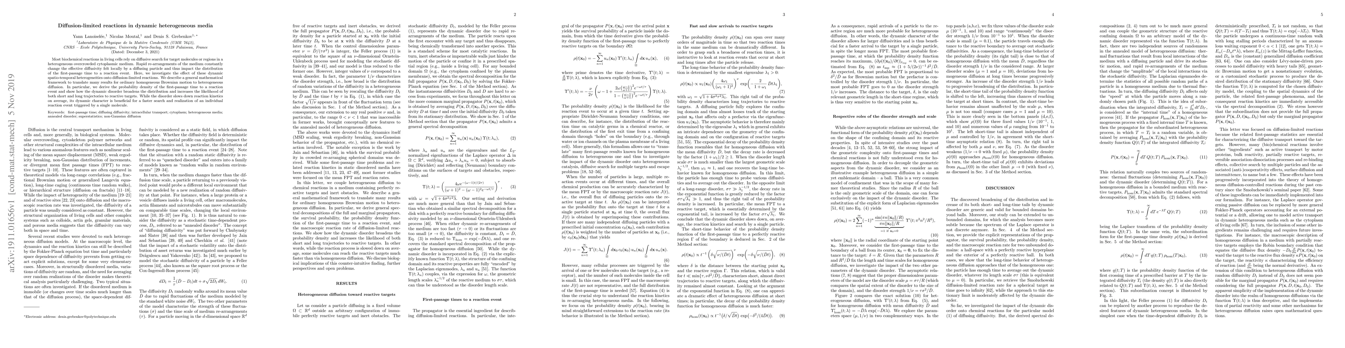 Most biochemical reactions in living cells rely on diffusive search for target molecules or regions in a heterogeneous overcrowded cytoplasmic medium. Rapid re-arrangements of the medium constantly change the effective diffusivity felt locally by a diffusing particle and thus impact the distribution of the first-passage time to a reaction event. Here, we investigate the effect of these dynamic spatio-temporal heterogeneities onto diffusion-limited reactions. We describe a general mathematical framework to translate many results for ordinary homogeneous Brownian motion to heterogeneous diffusion. In particular, we derive the probability density of the first-passage time to a reaction event and show how the dynamic disorder broadens the distribution and increases the likelihood of both short and long trajectories to reactive targets. While the disorder slows down reaction kinetics on average, its dynamic character is beneficial for a faster search and realization of an individual reaction event triggered by a single molecule.