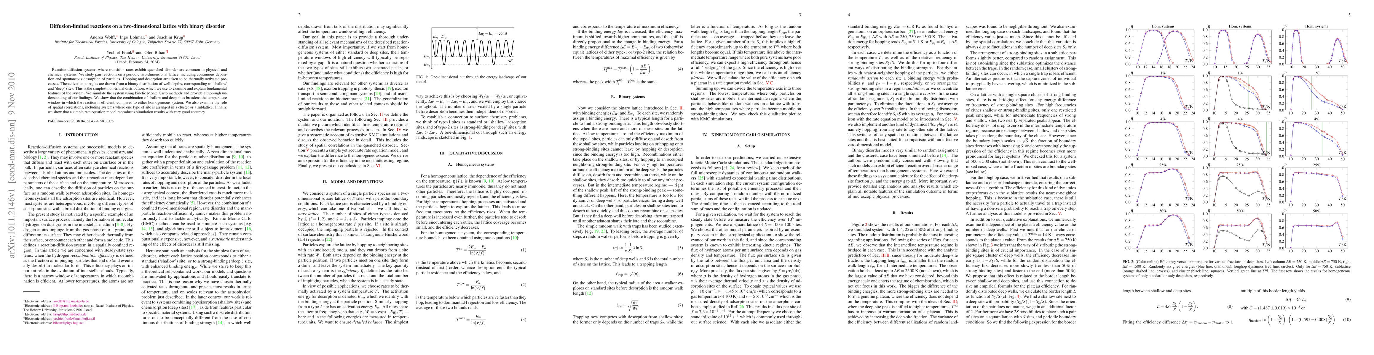 Researchers studied reaction-diffusion systems on a 2D lattice with binary disorder, finding that the combination of shallow and deep sites broadens the temperature window for efficient reactions. A simple rate equation model accurately reproduces simulation results.
