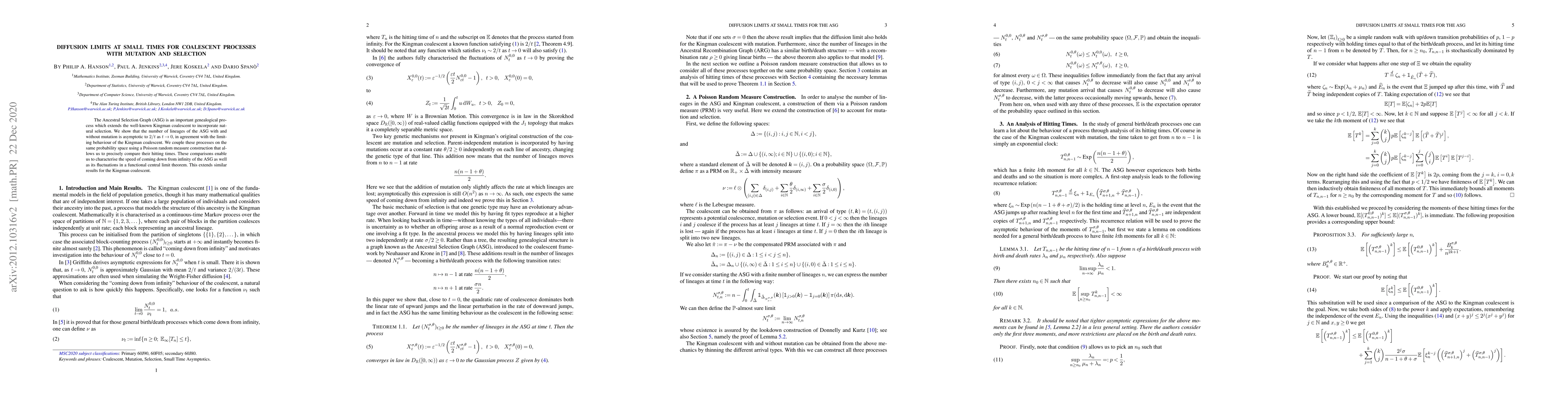 This paper investigates the diffusion limits of the Ancestral Selection Graph (ASG) at small times, showing its number of lineages asymptotically behaves like $2/t$ as $t$ approaches zero, akin to the Kingman coalescent. It employs a Poisson random measure to compare ASG processes with and without mutation, thereby characterizing their speed and fluctuations in a functional central limit theorem.