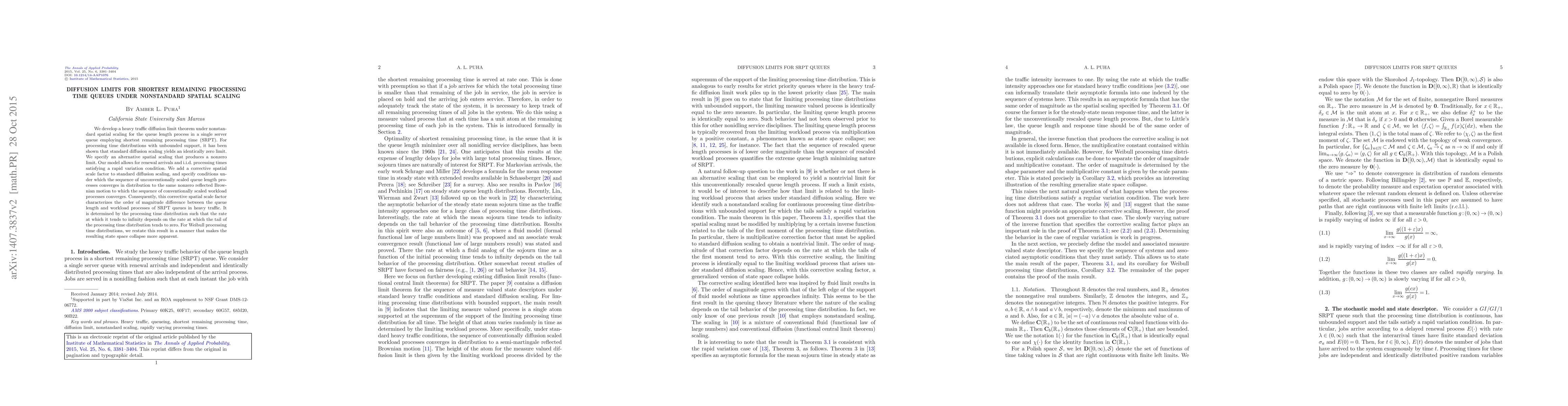 This paper develops a diffusion limit theorem under nonstandard spatial scaling for a single server queue using the shortest remaining processing time (SRPT) policy. It introduces a corrective spatial scale factor to standard diffusion scaling to achieve a nonzero limit for queue length processes, thereby characterizing the difference in magnitude between queue length and workload processes in heavy traffic.