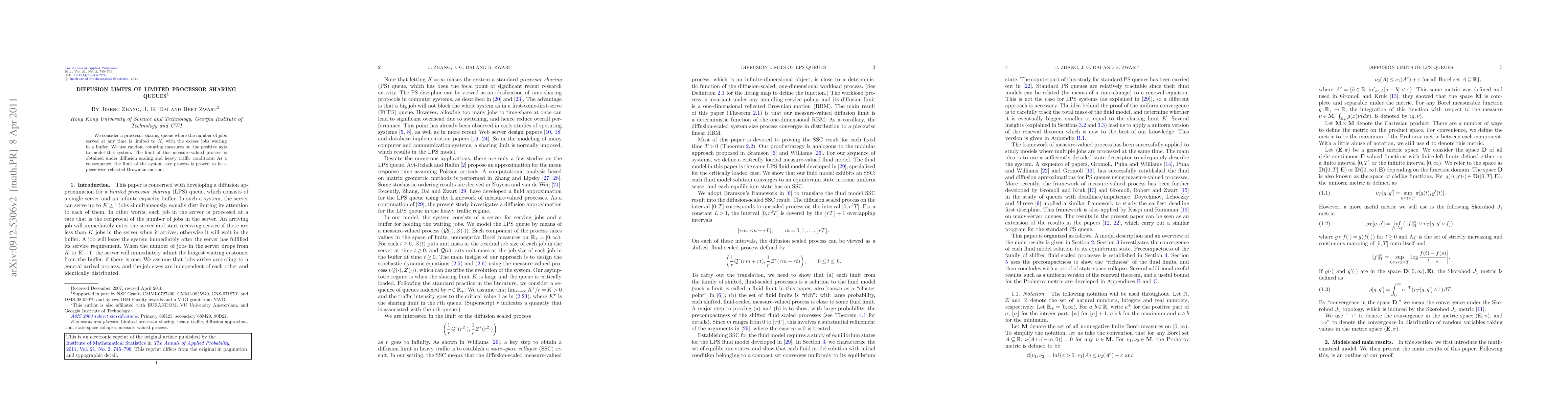 This paper studies a processor sharing queue with a job service limit of $K$, where excess jobs wait in a buffer. Under diffusion scaling and heavy traffic, the authors prove the system size process converges to a piece-wise reflected Brownian motion, using random counting measures on the positive axis.