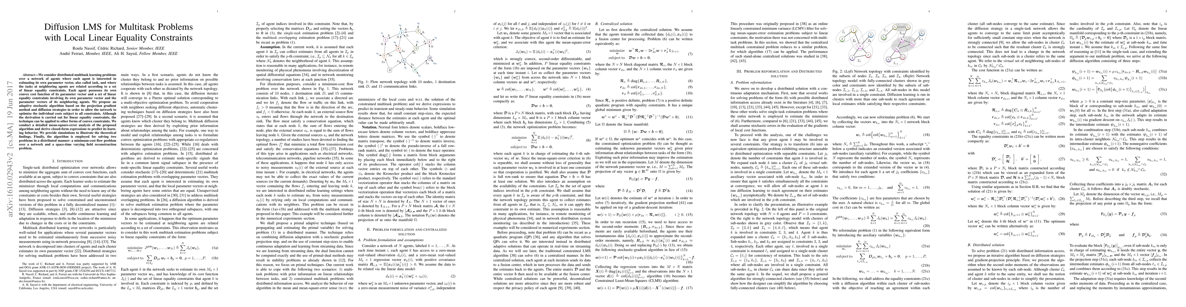 This paper proposes an adaptive stochastic algorithm for distributed multitask learning over a network, where each agent optimizes its own cost function subject to local linear equality constraints. The algorithm employs diffusion strategies and projection gradient methods, and is validated through mean-square-error analysis and simulations, demonstrating its effectiveness in solving minimum-cost flow and field reconstruction problems.
