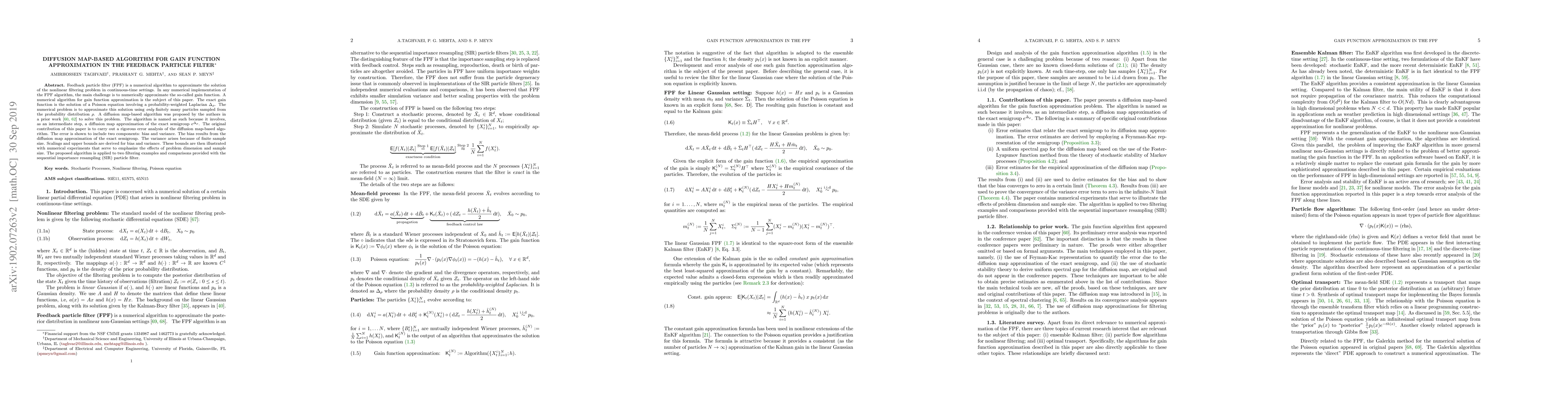 Feedback particle filter (FPF) is a numerical algorithm to approximate the solution of the nonlinear filtering problem in continuous-time settings. In any numerical implementation of the FPF algorithm, the main challenge is to numerically approximate the so-called gain function. A numerical algorithm for gain function approximation is the subject of this paper. The exact gain function is the solution of a Poisson equation involving a probability-weighted Laplacian $\Delta_\rho$. The numerical problem is to approximate this solution using {\em only} finitely many particles sampled from the probability distribution $\rho$. A diffusion map-based algorithm was proposed by the authors in a prior work to solve this problem. The algorithm is named as such because it involves, as an intermediate step, a diffusion map approximation of the exact semigroup $e^{\Delta_\rho}$. The original contribution of this paper is to carry out a rigorous error analysis of the diffusion map-based algorithm. The error is shown to include two components: bias and variance. The bias results from the diffusion map approximation of the exact semigroup. The variance arises because of finite sample size. Scalings and upper bounds are derived for bias and variance. These bounds are then illustrated with numerical experiments that serve to emphasize the effects of problem dimension and sample size. The proposed algorithm is applied to two filtering examples and comparisons provided with the sequential importance resampling (SIR) particle filter.