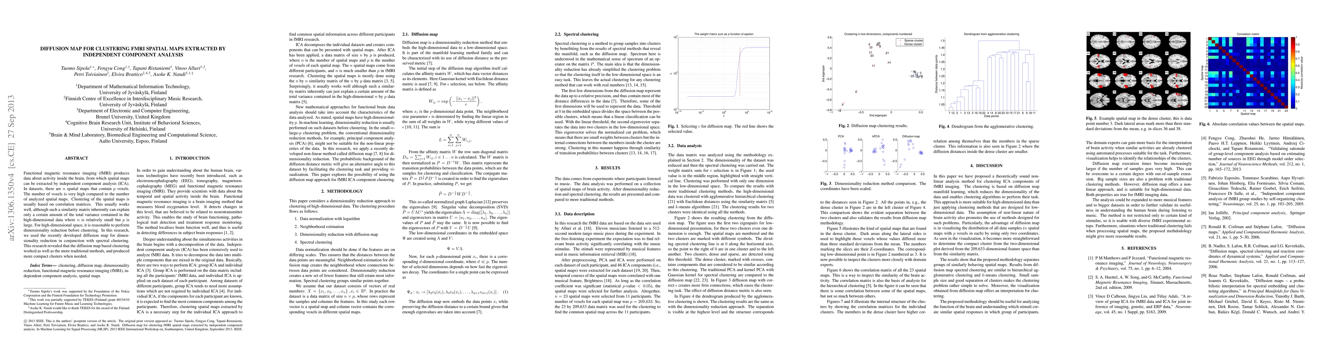 This research applies diffusion maps for dimensionality reduction followed by spectral clustering to fMRI spatial maps derived from independent component analysis, demonstrating comparable performance to traditional methods while producing more compact clusters in high-dimensional data.
