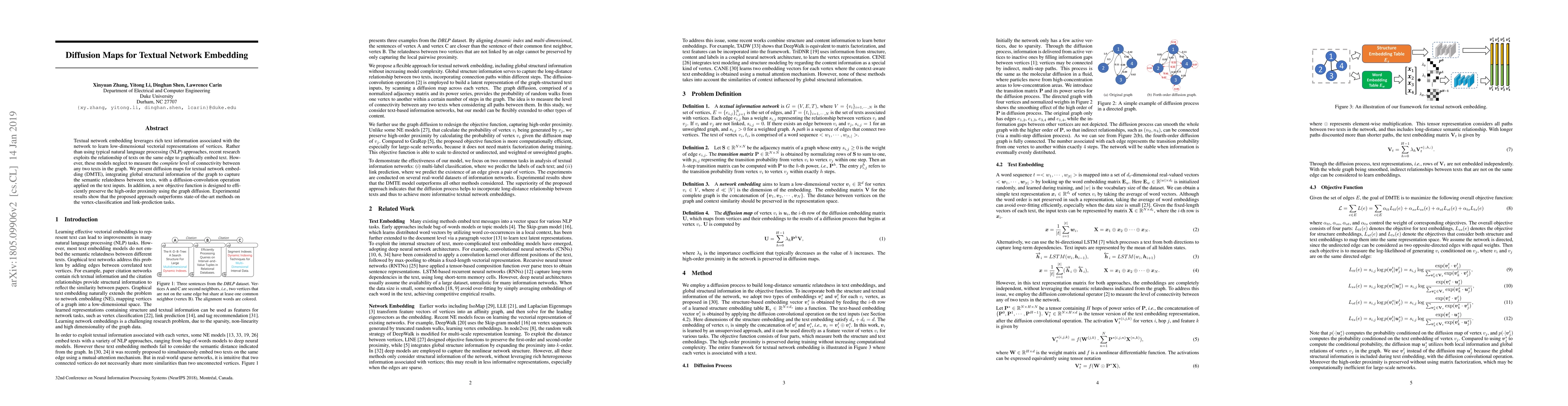 The paper introduces diffusion maps for textual network embedding (DMTE), which integrates global structural information to capture semantic relatedness between texts using a diffusion-convolution operation. The proposed method outperforms existing techniques in vertex-classification and link-prediction tasks.