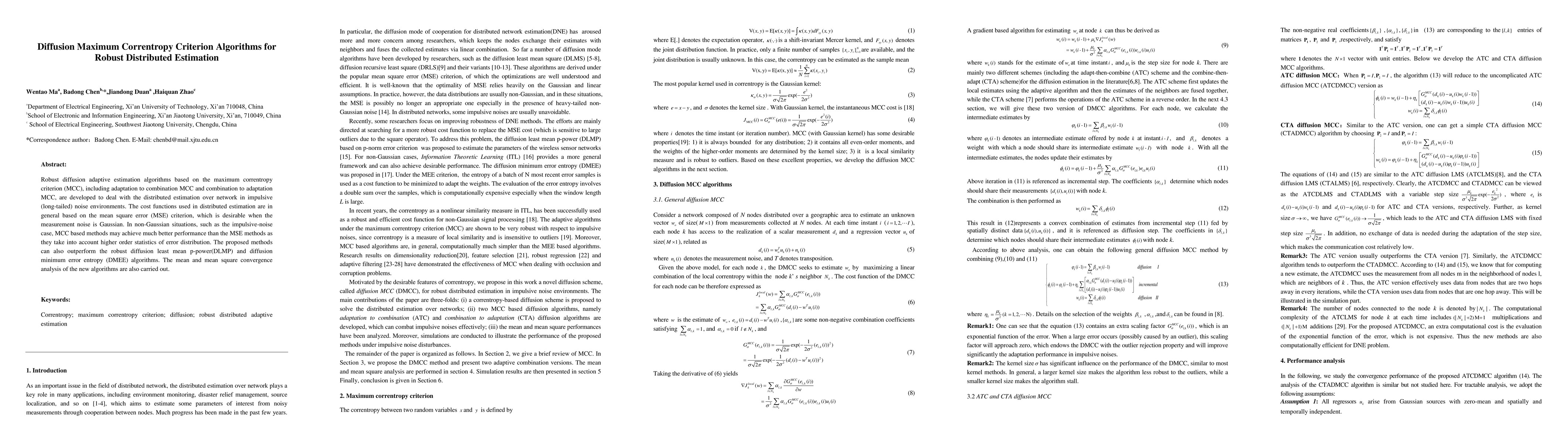 This paper develops robust diffusion adaptive estimation algorithms based on the maximum correntropy criterion (MCC) for distributed estimation in impulsive noise environments. The proposed MCC-based methods outperform traditional mean square error (MSE) methods and other robust algorithms like DLMP and DMEE by considering higher-order statistics of error distribution. The paper also conducts mean and mean square convergence analysis of the new algorithms.
