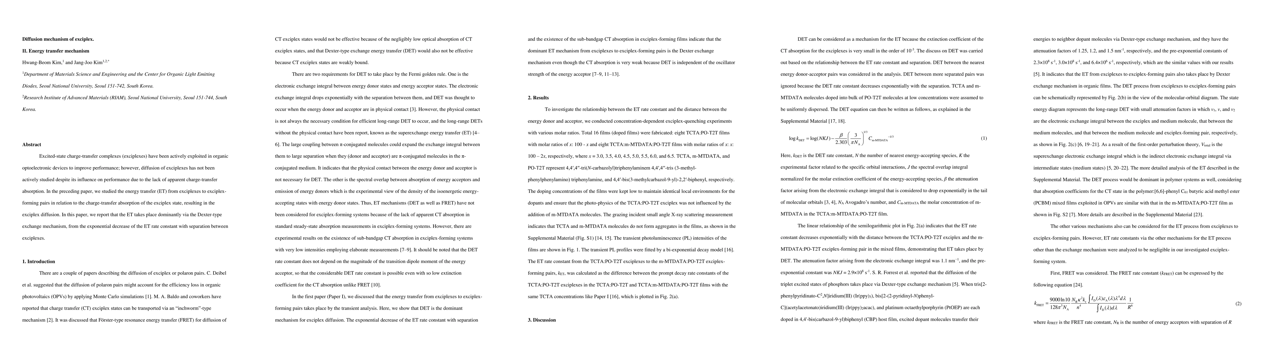 Research on exciplex diffusion reveals that energy transfer occurs primarily through a Dexter-type exchange mechanism, decreasing with separation between exciplexes, affecting organic optoelectronic device performance.