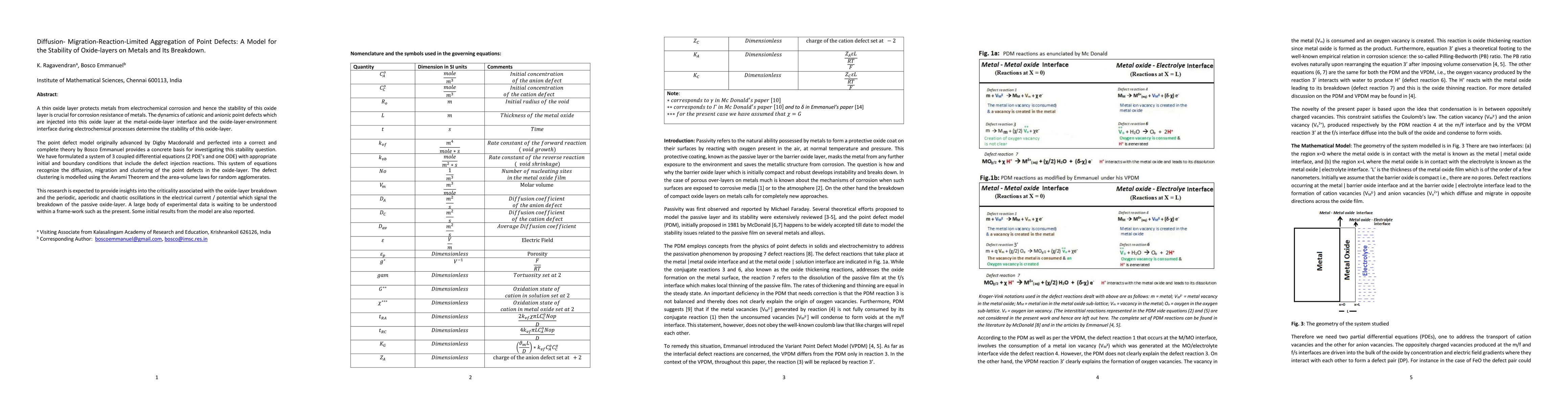 A thin oxide layer protects metals from electrochemical corrosion and hence the stability of this oxide layer is crucial for corrosion resistance of metals. The dynamics of cationic and anionic point defects which are injected into this oxide layer at the metal-oxide-layer interface and the oxide-layer-environment interface during electrochemical processes determine the stability of this oxide-layer. The point defect model originally advanced by Digby Macdonald and perfected into a correct and complete theory by Bosco Emmanuel provides a concrete basis for investigating this stability question. We have formulated a system of 3 coupled differential equations (2 PDEs and one ODE) with appropriate initial and boundary conditions that include the defect injection reactions. This system of equations recognize the diffusion, migration and clustering of the point defects in the oxide-layer. The defect clustering is modelled using the Avrami Theorem and the area-volume laws for random agglomerates. This research is expected to provide insights into the criticality associated with the oxide-layer breakdown and the periodic, aperiodic and chaotic oscillations in the electrical current / potential which signal the breakdown of the passive oxide-layer. A large body of experimental data is waiting to be understood within a frame-work such as the present. Some initial results from the model are also reported.