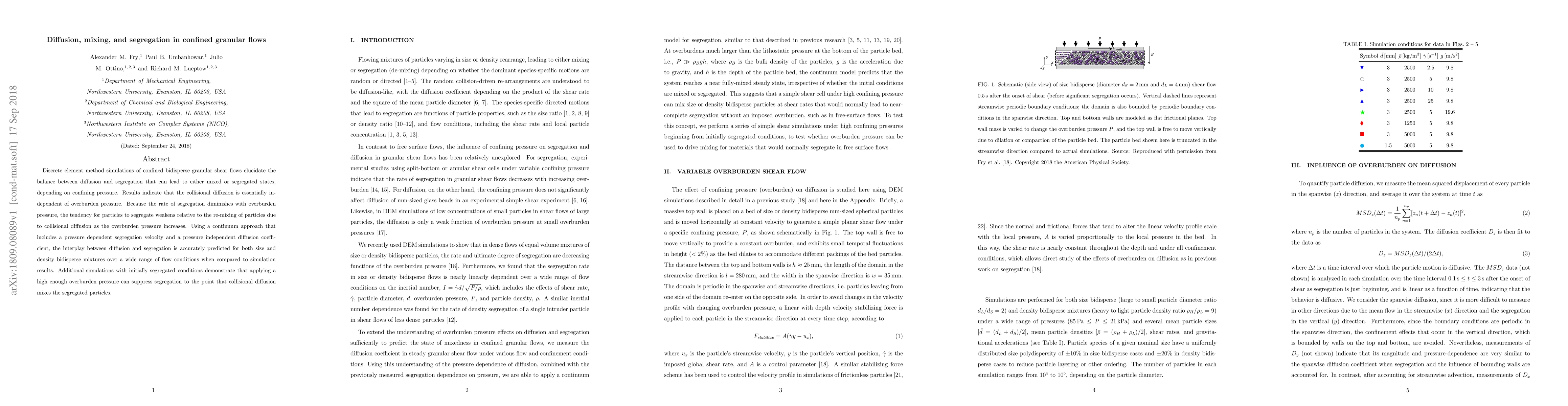 The research employs discrete element method (DEM) simulations to study confined bidisperse granular shear flows, analyzing the balance between diffusion and segregation under varying overburden pressures.