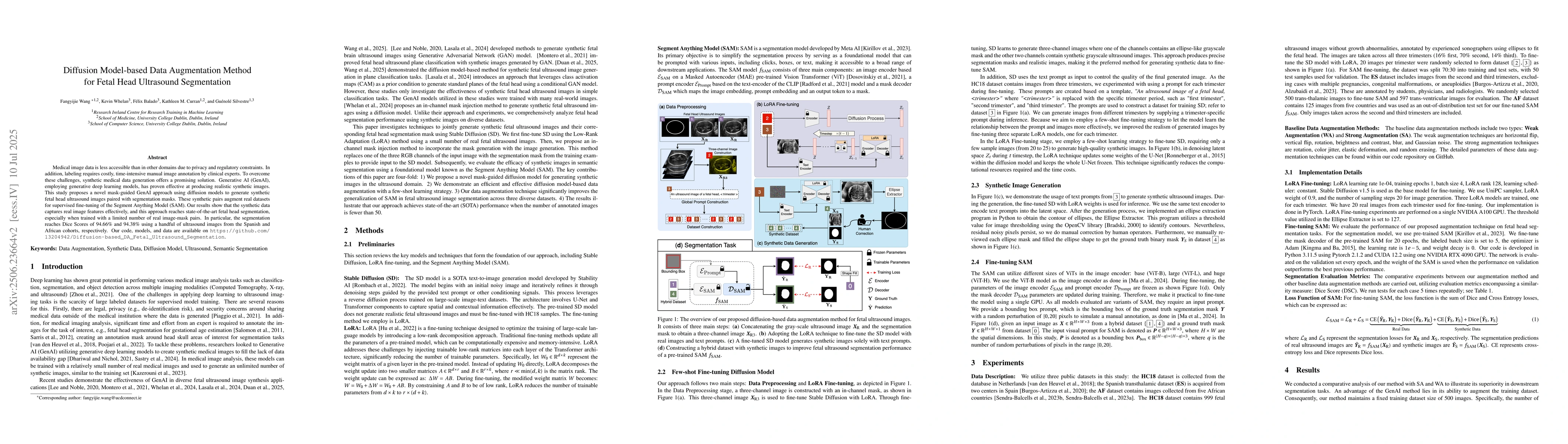 Medical image data is less accessible than in other domains due to privacy and regulatory constraints. In addition, labeling requires costly, time-intensive manual image annotation by clinical experts. To overcome these challenges, synthetic medical data generation offers a promising solution. Generative AI (GenAI), employing generative deep learning models, has proven effective at producing realistic synthetic images. This study proposes a novel mask-guided GenAI approach using diffusion models to generate synthetic fetal head ultrasound images paired with segmentation masks. These synthetic pairs augment real datasets for supervised fine-tuning of the Segment Anything Model (SAM). Our results show that the synthetic data captures real image features effectively, and this approach reaches state-of-the-art fetal head segmentation, especially when trained with a limited number of real image-mask pairs. In particular, the segmentation reaches Dice Scores of 94.66\% and 94.38\% using a handful of ultrasound images from the Spanish and African cohorts, respectively. Our code, models, and data are available on GitHub.