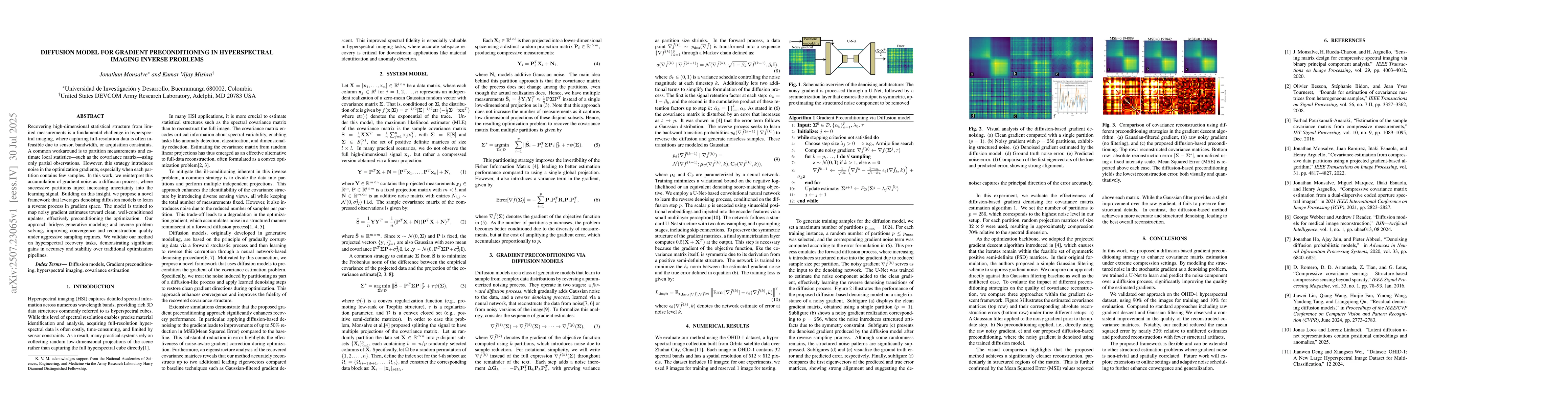 Recovering high-dimensional statistical structure from limited measurements is a fundamental challenge in hyperspectral imaging, where capturing full-resolution data is often infeasible due to sensor, bandwidth, or acquisition constraints. A common workaround is to partition measurements and estimate local statistics-such as the covariance matrix-using only partial observations. However, this strategy introduces noise in the optimization gradients, especially when each partition contains few samples. In this work, we reinterpret this accumulation of gradient noise as a diffusion process, where successive partitions inject increasing uncertainty into the learning signal. Building on this insight, we propose a novel framework that leverages denoising diffusion models to learn a reverse process in gradient space. The model is trained to map noisy gradient estimates toward clean, well-conditioned updates, effectively preconditioning the optimization. Our approach bridges generative modeling and inverse problem solving, improving convergence and reconstruction quality under aggressive sampling regimes. We validate our method on hyperspectral recovery tasks, demonstrating significant gains in accuracy and stability over traditional optimization pipelines.