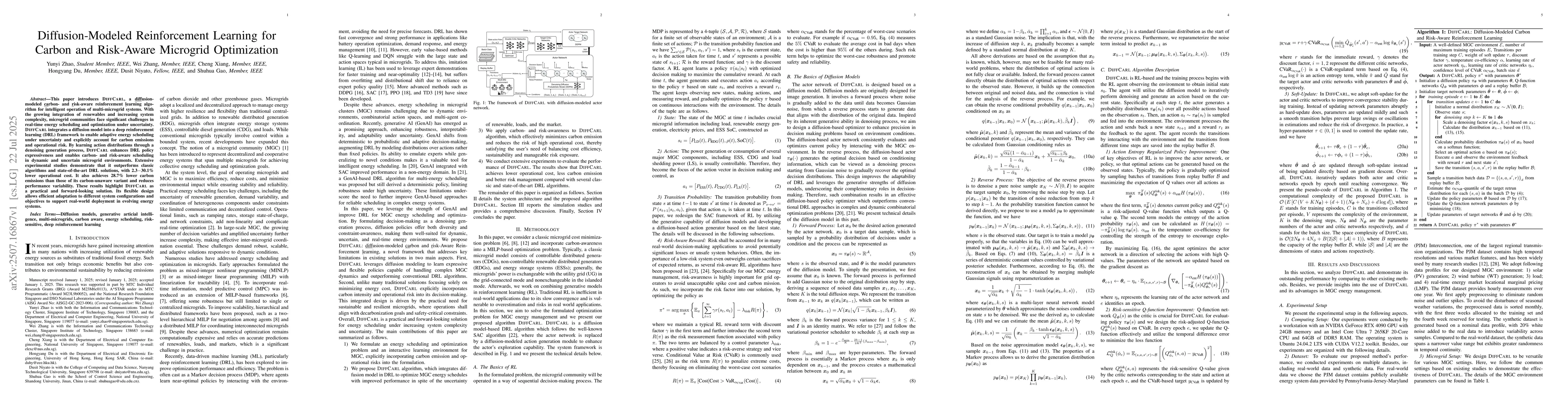 This paper introduces DiffCarl, a diffusion-modeled carbon- and risk-aware reinforcement learning algorithm for intelligent operation of multi-microgrid systems. With the growing integration of renewables and increasing system complexity, microgrid communities face significant challenges in real-time energy scheduling and optimization under uncertainty. DiffCarl integrates a diffusion model into a deep reinforcement learning (DRL) framework to enable adaptive energy scheduling under uncertainty and explicitly account for carbon emissions and operational risk. By learning action distributions through a denoising generation process, DiffCarl enhances DRL policy expressiveness and enables carbon- and risk-aware scheduling in dynamic and uncertain microgrid environments. Extensive experimental studies demonstrate that it outperforms classic algorithms and state-of-the-art DRL solutions, with 2.3-30.1% lower operational cost. It also achieves 28.7% lower carbon emissions than those of its carbon-unaware variant and reduces performance variability. These results highlight DiffCarl as a practical and forward-looking solution. Its flexible design allows efficient adaptation to different system configurations and objectives to support real-world deployment in evolving energy systems.