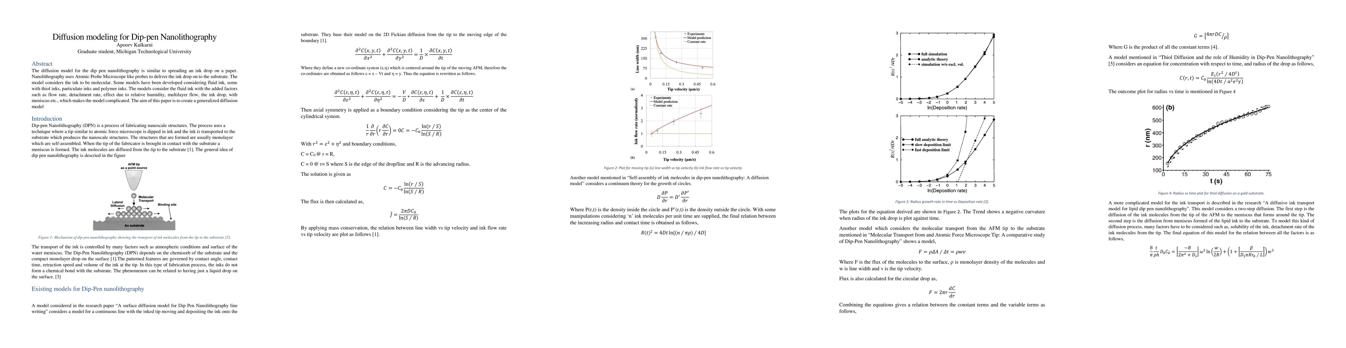 Title: Diffusion modeling for Dip-pen Nanolithography Summary: This paper develops a generalized diffusion model for dip pen nanolithography, considering molecular ink spread dynamics, influenced by factors like flow rate and relative humidity, to enhance understanding of ink behavior on substrates.