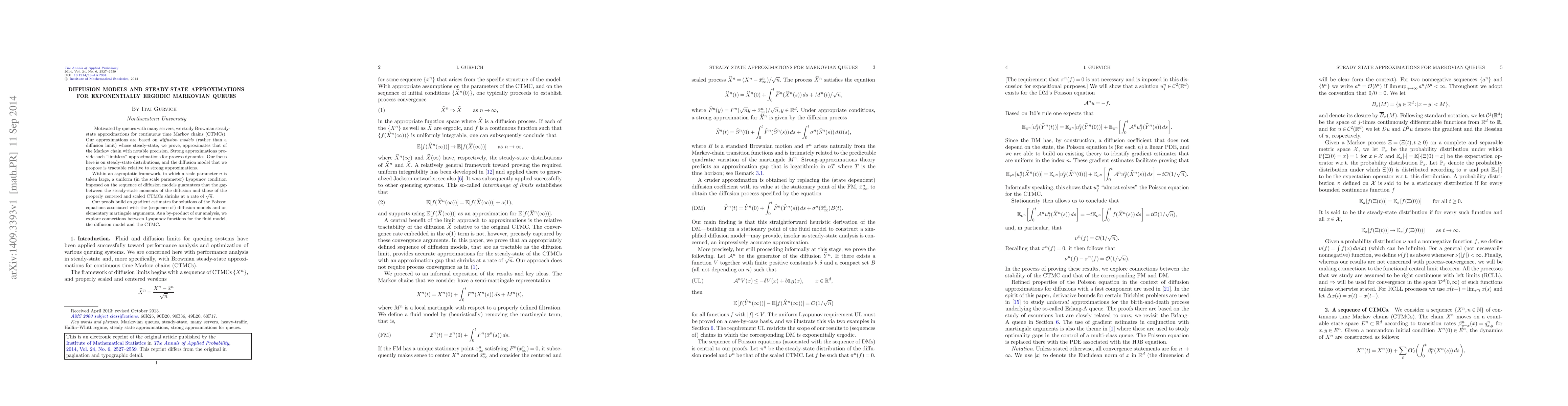Motivated by queues with many servers, we study Brownian steady-state approximations for continuous time Markov chains (CTMCs). Our approximations are based on diffusion models (rather than a diffusion limit) whose steady-state, we prove, approximates that of the Markov chain with notable precision. Strong approximations provide such "limitless" approximations for process dynamics. Our focus here is on steady-state distributions, and the diffusion model that we propose is tractable relative to strong approximations. Within an asymptotic framework, in which a scale parameter $n$ is taken large, a uniform (in the scale parameter) Lyapunov condition imposed on the sequence of diffusion models guarantees that the gap between the steady-state moments of the diffusion and those of the properly centered and scaled CTMCs shrinks at a rate of $\sqrt{n}$. Our proofs build on gradient estimates for solutions of the Poisson equations associated with the (sequence of) diffusion models and on elementary martingale arguments. As a by-product of our analysis, we explore connections between Lyapunov functions for the fluid model, the diffusion model and the CTMC.