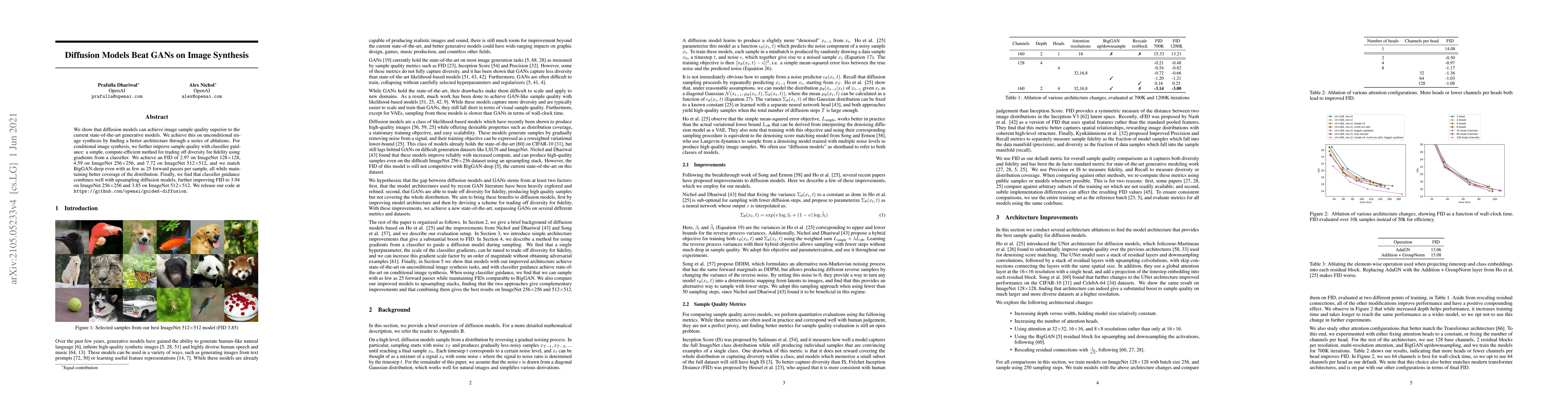 We show that diffusion models can achieve image sample quality superior to the current state-of-the-art generative models. We achieve this on unconditional image synthesis by finding a better architecture through a series of ablations. For conditional image synthesis, we further improve sample quality with classifier guidance: a simple, compute-efficient method for trading off diversity for fidelity using gradients from a classifier. We achieve an FID of 2.97 on ImageNet 128$\times$128, 4.59 on ImageNet 256$\times$256, and 7.72 on ImageNet 512$\times$512, and we match BigGAN-deep even with as few as 25 forward passes per sample, all while maintaining better coverage of the distribution. Finally, we find that classifier guidance combines well with upsampling diffusion models, further improving FID to 3.94 on ImageNet 256$\times$256 and 3.85 on ImageNet 512$\times$512. We release our code at https://github.com/openai/guided-diffusion