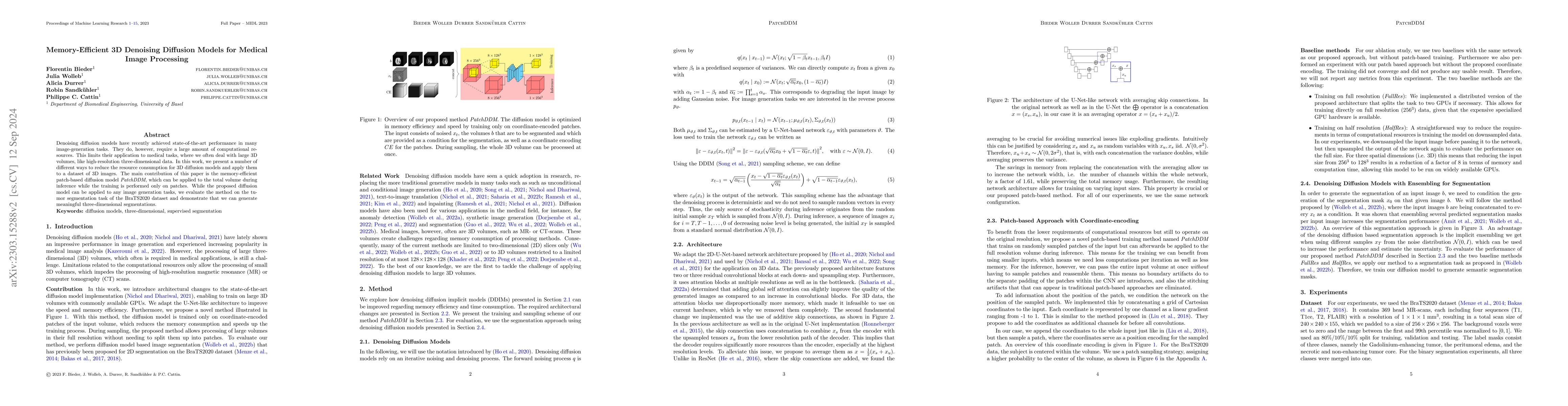 Denoising diffusion models have recently achieved state-of-the-art performance in many image-generation tasks. They do, however, require a large amount of computational resources. This limits their application to medical tasks, where we often deal with large 3D volumes, like high-resolution three-dimensional data. In this work, we present a number of different ways to reduce the resource consumption for 3D diffusion models and apply them to a dataset of 3D images. The main contribution of this paper is the memory-efficient patch-based diffusion model \textit{PatchDDM}, which can be applied to the total volume during inference while the training is performed only on patches. While the proposed diffusion model can be applied to any image generation tasks, we evaluate the method on the tumor segmentation task of the BraTS2020 dataset and demonstrate that we can generate meaningful three-dimensional segmentations.