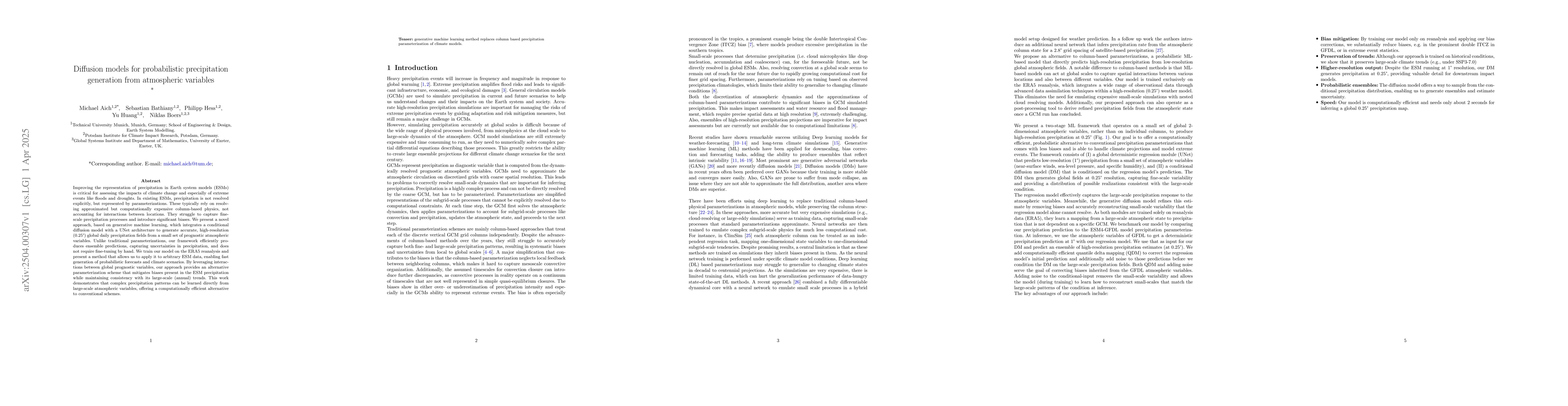 This work demonstrates that complex precipitation patterns can be learned directly from large-scale atmospheric variables using generative machine learning, providing a computationally efficient alternative to traditional parameterization schemes.