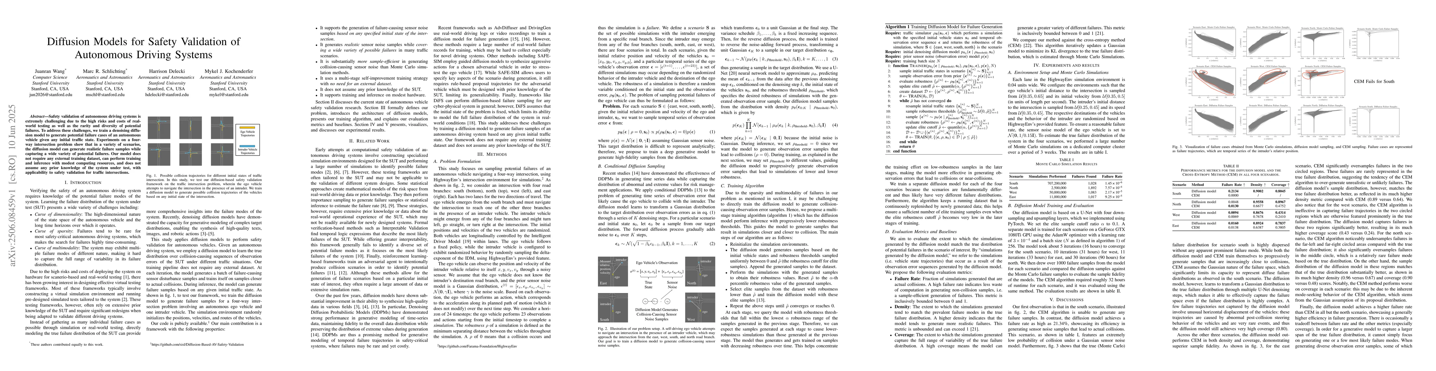 Safety validation of autonomous driving systems is extremely challenging due to the high risks and costs of real-world testing as well as the rarity and diversity of potential failures. To address these challenges, we train a denoising diffusion model to generate potential failure cases of an autonomous vehicle given any initial traffic state. Experiments on a four-way intersection problem show that in a variety of scenarios, the diffusion model can generate realistic failure samples while capturing a wide variety of potential failures. Our model does not require any external training dataset, can perform training and inference with modest computing resources, and does not assume any prior knowledge of the system under test, with applicability to safety validation for traffic intersections.