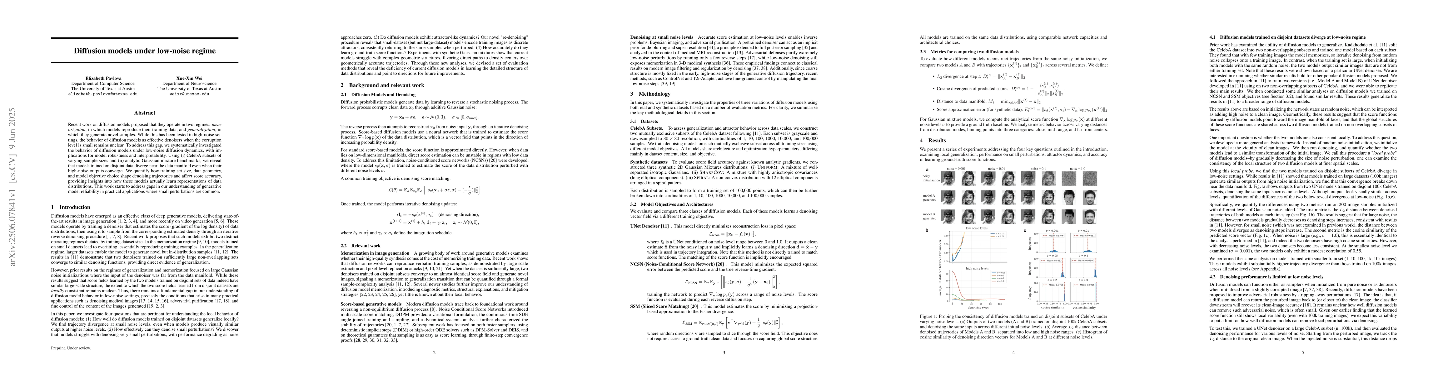 Recent work on diffusion models proposed that they operate in two regimes: memorization, in which models reproduce their training data, and generalization, in which they generate novel samples. While this has been tested in high-noise settings, the behavior of diffusion models as effective denoisers when the corruption level is small remains unclear. To address this gap, we systematically investigated the behavior of diffusion models under low-noise diffusion dynamics, with implications for model robustness and interpretability. Using (i) CelebA subsets of varying sample sizes and (ii) analytic Gaussian mixture benchmarks, we reveal that models trained on disjoint data diverge near the data manifold even when their high-noise outputs converge. We quantify how training set size, data geometry, and model objective choice shape denoising trajectories and affect score accuracy, providing insights into how these models actually learn representations of data distributions. This work starts to address gaps in our understanding of generative model reliability in practical applications where small perturbations are common.